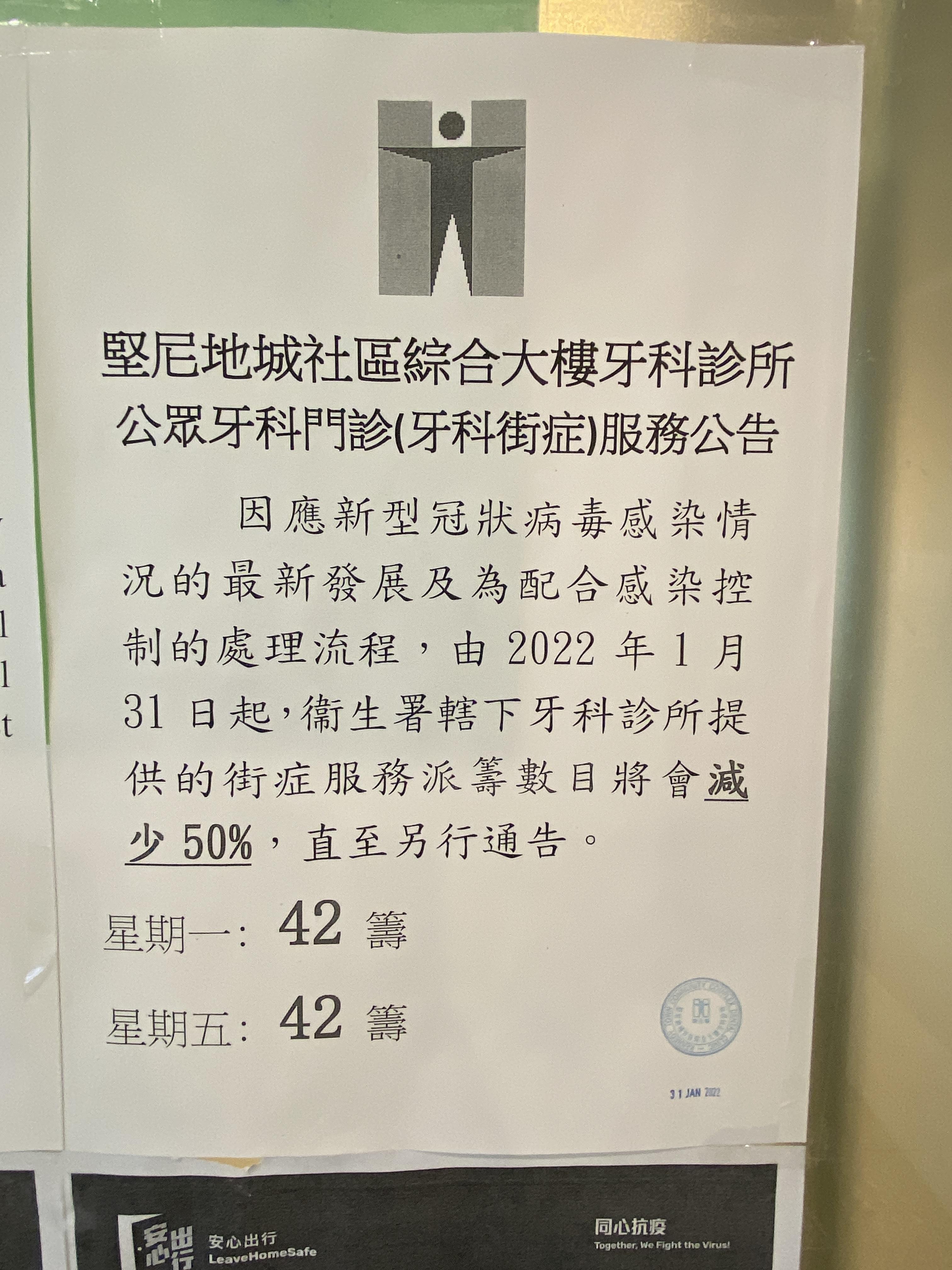 目前39間政府牙科診所中有11間提供街症服務,當中有兩間位於相當隔涉的大澳及長洲。相關診所一星期只會開放一至兩天上午予公眾,每次派21至42張街籌,服務亦只限於緊急牙科治療,即脫牙及止痛,市民若要在公營醫療系統中「睇牙」,可謂困難重重。