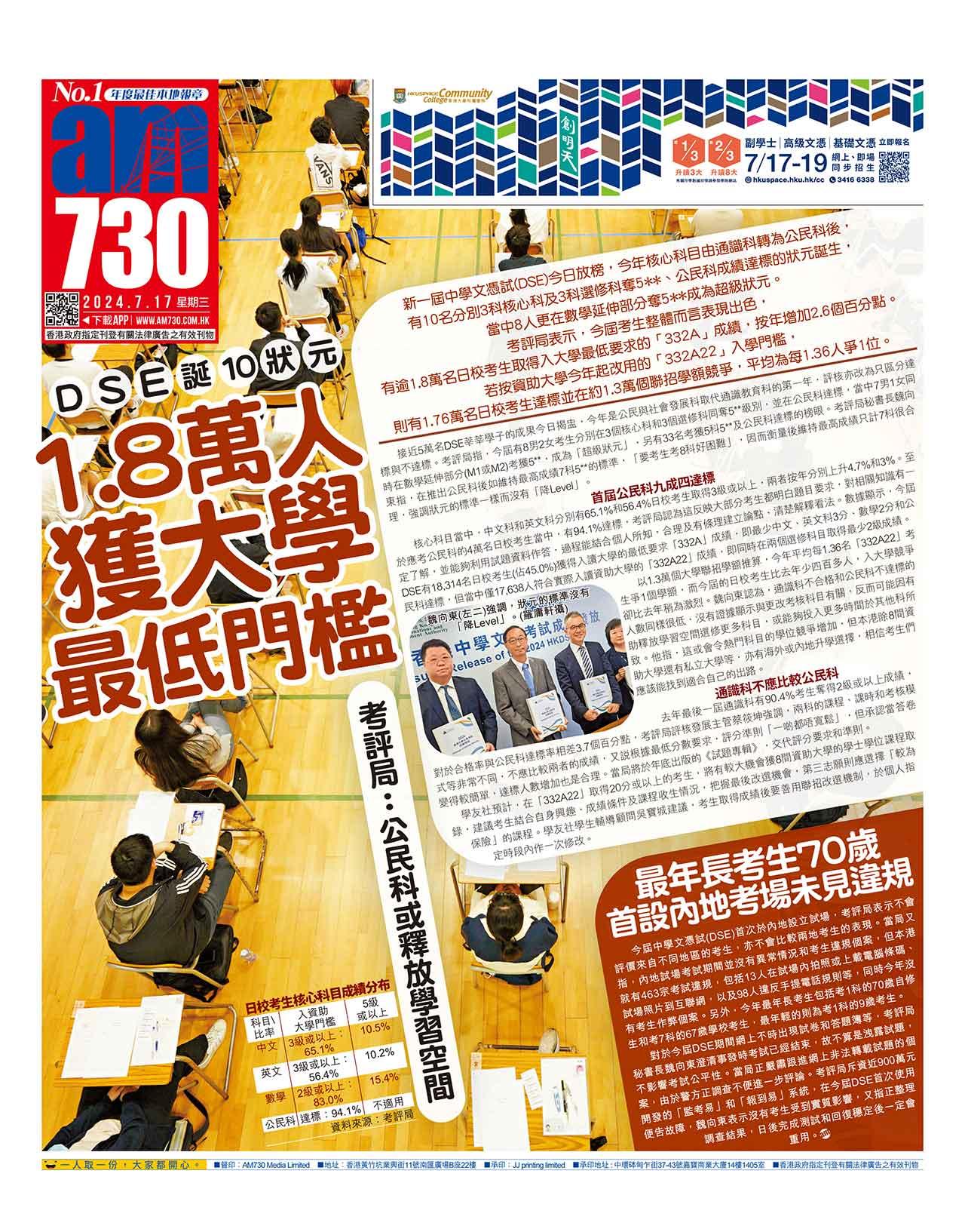 新一屆中學文憑試(DSE)今日放榜,今年核心科目由通識科轉為公民科後,有10名分別3科核心科及3科選修科奪5**、公民科成績達標的狀元誕生,當中8人更在數學延伸部分奪5**成為超級狀元。考評局表示,今屆考生整體而言表現出色,有逾1.8萬名日校考生取得入大學最低要求的「332A」成績,按年增加2.6個百分點。若按資助大學今年起改用的「332A22」入學門檻,則有1.76萬名日校考生達標並在約1.3萬個聯招學額競爭,平均為每1.36人爭1位。