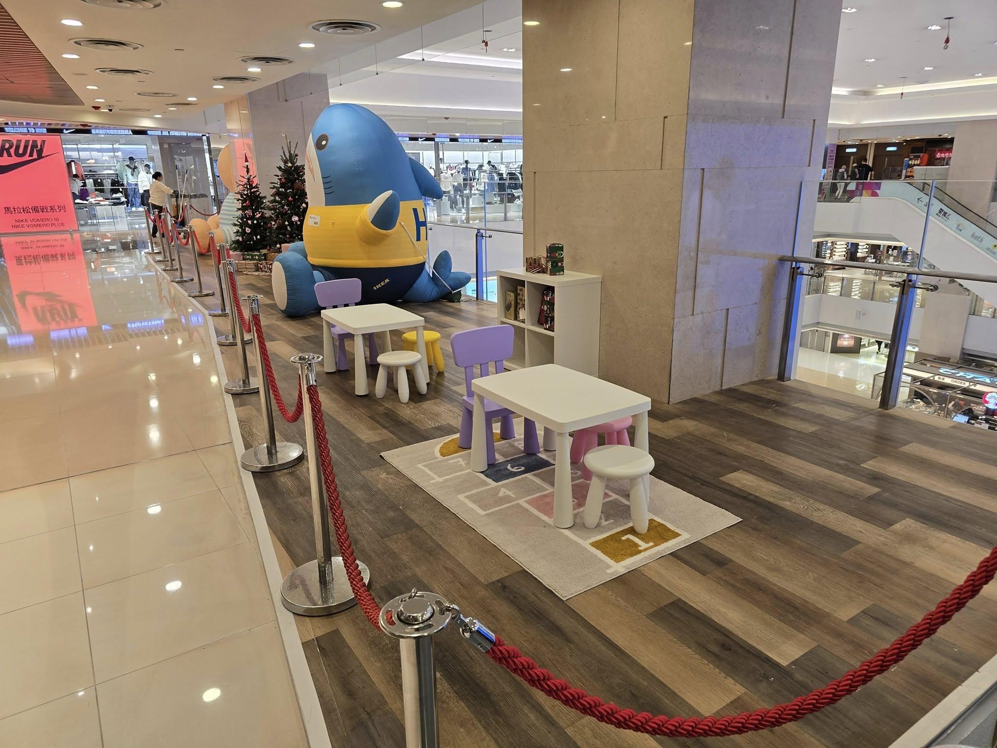 社交平台相片可見,IKEA已在屯門市廣場1期3樓位置圍版進行裝修工程,舖位對出空間位置放置家具陳列品及兩隻巨型吉祥物鯊魚和泰迪熊公仔,公仔旁亦放有寫上「宜家嚟啦!」告示架。