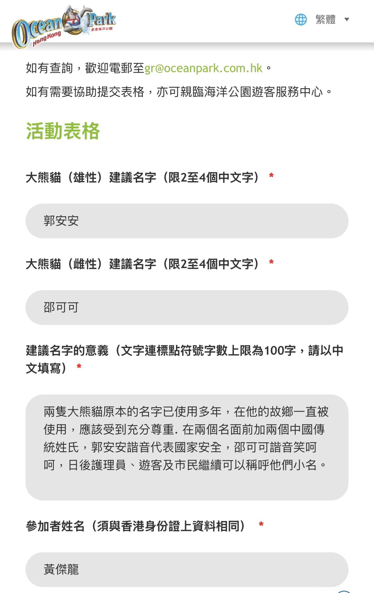 大熊貓安安、可可9月26日抵港,適應緊香港海洋公園新環境,政府就宣布舉辦熊貓命名比賽,喺今個月27號前,參加者可以提交建議嘅名稱,並且用100字以內解釋命名特色。敘福樓主席黃傑龍(Simon)亦都湊一湊熱鬧參加比賽,提議大熊貓可以改名做「郭安安」同「邵可可」,取其諧音表示國家安全,同埋笑呵呵,都算幾有心思。