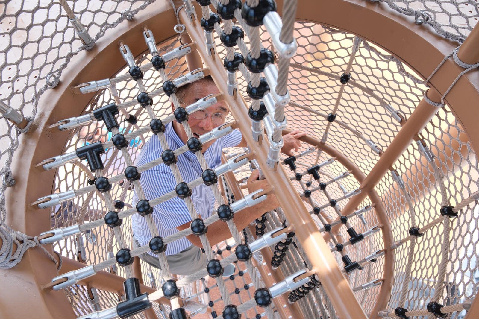 不過,田北辰話爬上爬落就要有少少技巧,佢初初用膝頭去爬係有啲辛苦,點知爬咗兩次就發覺自己有啲蠢,原來中間有繩可以踩,之後幾次一踩上去就輕鬆好多喎。由相片可見,田北辰嘅同事都好緊張佢嘅安危,喺滑梯下方接住田北辰。而田北辰唔單止瀡滑梯,仲玩埋韆鞦,見到佢樂在其中呀。佢鼓勵各位70歲以上嘅長者,如果覺得身體健康良好、又想嘗試新嘢,都可以帶埋啲孫仔孫女一齊嚟玩!不過美中不足嘅係,可能田北辰喺烈日12點半之下嘗試,形容去到滑梯最尾就好似入咗「地獄」咁,仲差啲焫親,建議政府興建遮蔭上蓋。