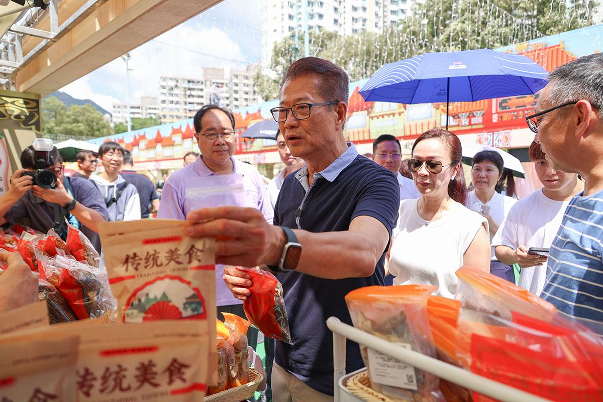 為慶祝國慶76周年,九龍東潮人聯會同九龍西潮人聯會一連4日喺九龍城舉辦嘅「潮玩×潮IN」潮汕文化嘉年華,今日嚟到最後一日。財政司司長陳茂波今日到場,先欣賞繡扇同潮州手拉朱泥壺製作過程,然後品嘗多款潮汕特色飲食,包括潮州魚蛋、牛丸、潮式鹵水等,佢食完不禁用潮州話盛讚「好好食,個個食」。