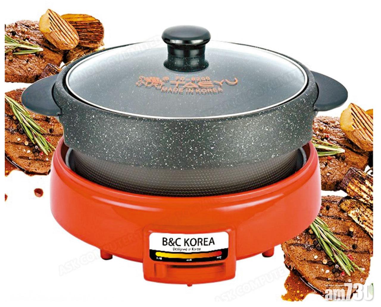 未必人人都有本事團年飯煮「九大簋」,一於化繁為簡吃火鍋或烤肉!韓國B&C多功能麥飯石涮雙層烤肉盤烤鍋,備有不黏煎烤盤及涮煮兩用鍋,前者條狀架空設計預留足夠倒油空間,保證食物鮮嫩時加熱更均勻,後者鴛鴦款一鍋兩味,鍋深約為10cm,不會外濺湯汁,煮涮更方便。一鍵火力調節,高、中、低三段適合烹煮不同美食。