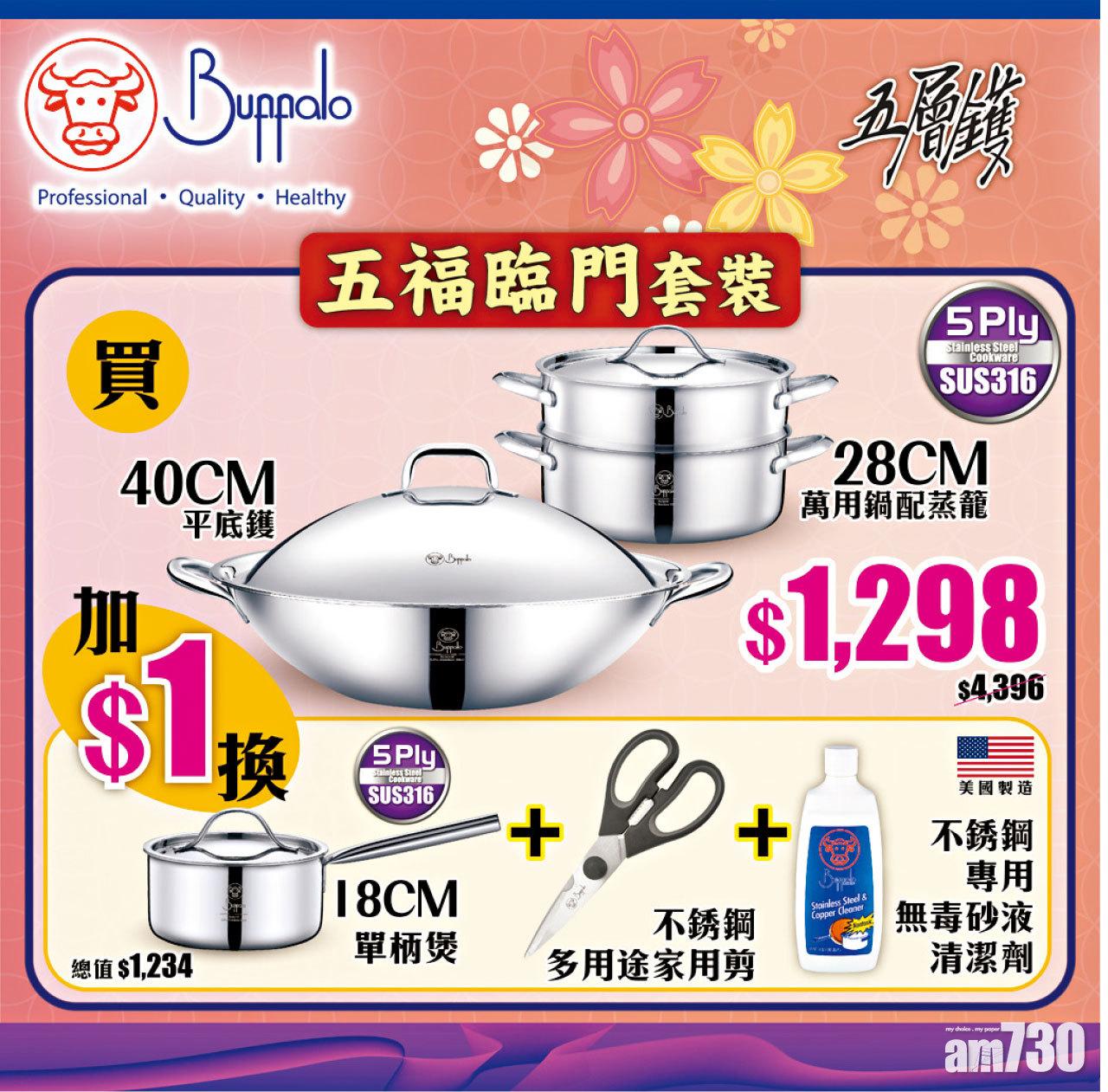 牛轉乾坤迎新春,Buffalo牛頭牌推出五福臨門套裝,組合價只需$1,298(原價$4,396)即可買走316不銹鋼五層40cm平底鑊及316不銹鋼五層28cm萬用鍋配蒸籠,加$1更可換購316不銹鋼五層18cm單柄煲、不銹鋼多用途家用剪及美國製不銹鋼專用無毒砂液清潔劑。316不銹鋼物料為優質醫療級不銹鋼,傳熱快散熱慢,物理性不黐底,易清洗,適用於多種爐具。