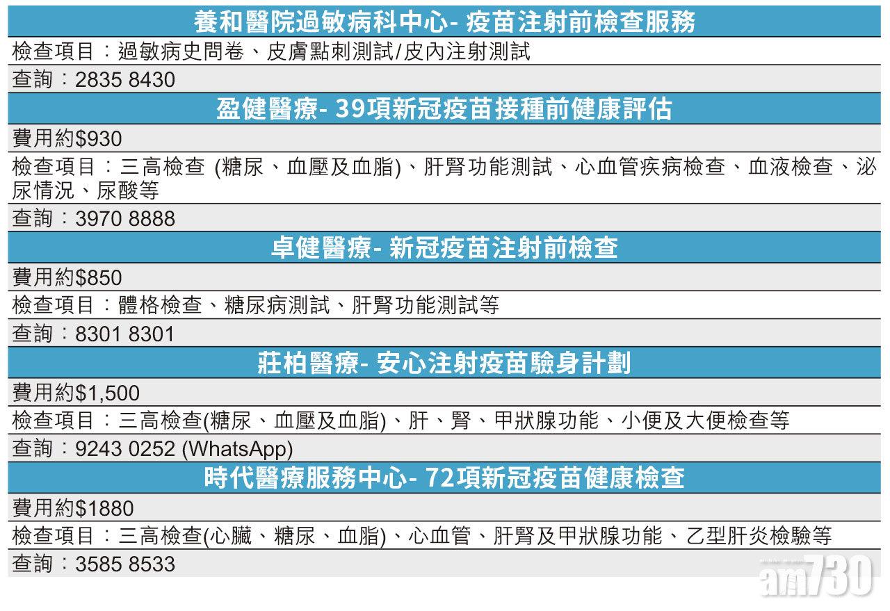 一場疫症,一支疫苗引起大眾對身體檢查的關注。根據衛生署指引,大部分健康人士都建議接種新冠疫苗,但發燒、12歲以下兒童、孕婦、哺乳期的婦女、患有慢性疾病、過敏史等人士就應先諮詢醫生意見。不過並不是每人都了解自己是否患有慢性病或過敏史,有建議指接種前可先進行身體檢查及諮詢醫生意見,從而選擇合適疫苗,減少接種後出現嚴重副作用的風險。現時更有不少私營醫療機構推出接種新冠疫苗的主題檢查,讓高危人士及沒有定期驗身的人士判斷自已是否適合接種疫苗。
