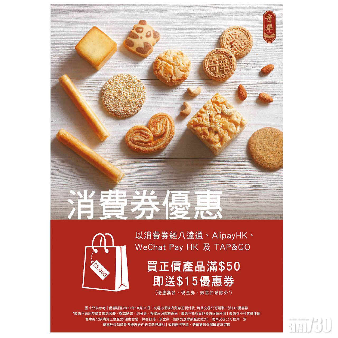 顧客由即日起至10月31日期間到奇華餅家全線分店(香港國際機場分店除外),單一消費購物滿$50,並透過四大指定電子支付工具,包括八達通、AlipayHK、WeChat Pay HK及TAP&GO使用電子消費券全數付款,即獲贈港幣15元正現金優惠券一張。消費簡易方便,再一次讓您購物更盡興。優惠更適用於大部分正價貨品,想大量入手奇華王牌糕點,傳統中西式餅食,就是時候了!
