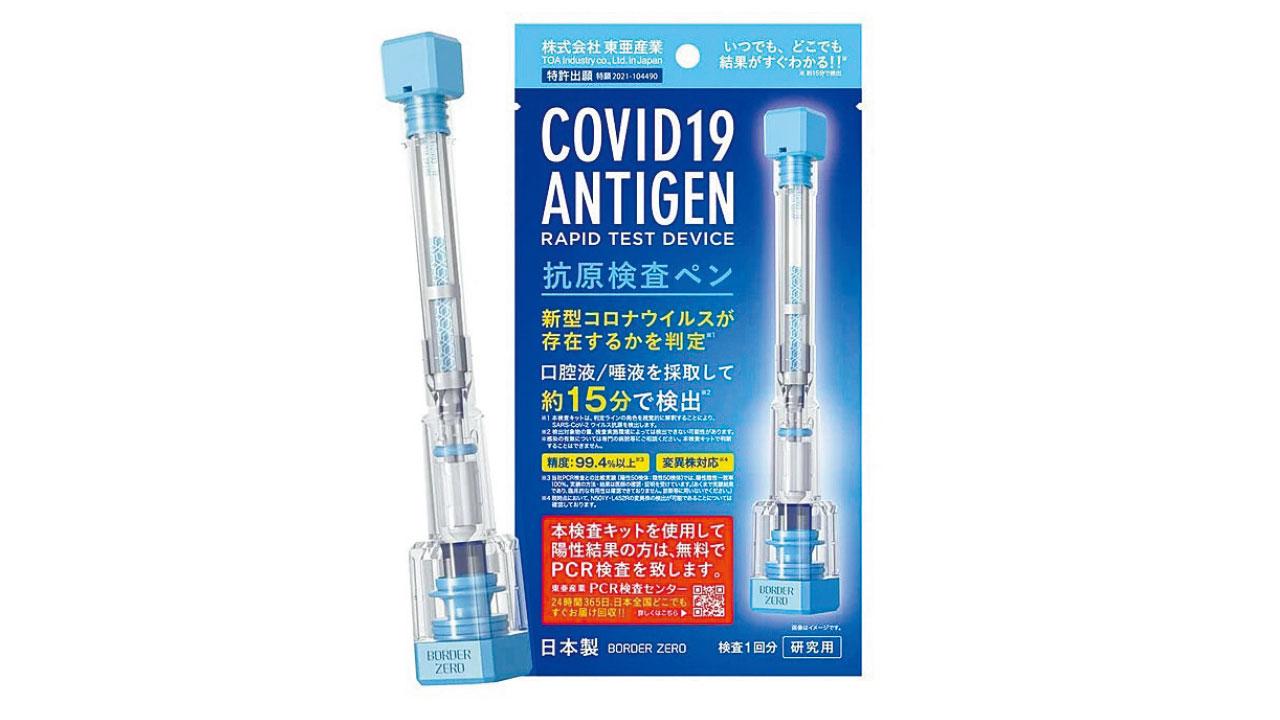由日本東亞產業研發的新冠病毒抗原自我檢測套裝,日本製造,比市面上一般檢測更簡單易用,只需要將試紙塗上舌頭及喉嚨收集,含住約2分鐘,再放入收集器約15分鐘即顯示結果,準確度達到99.4%以上。說明書建議避免進食、飲水、刷牙和漱口後立即使用,至少等待30分鐘後進行檢查。每盒平均$70。