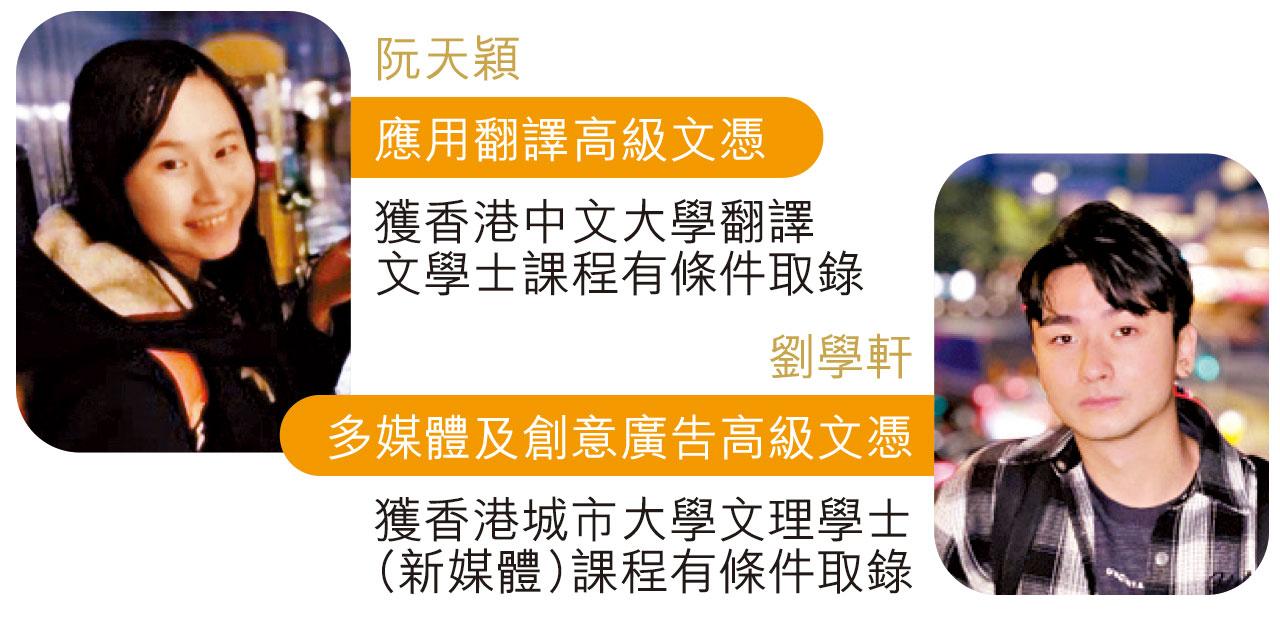 [左]阮天穎 應用翻譯高級文憑 獲香港中文大學翻譯 文學士課程有條件取錄 [右]劉學軒 多媒體及創意廣告高級文憑 獲香港城市大學文理學士(新媒體)課程有條件取錄