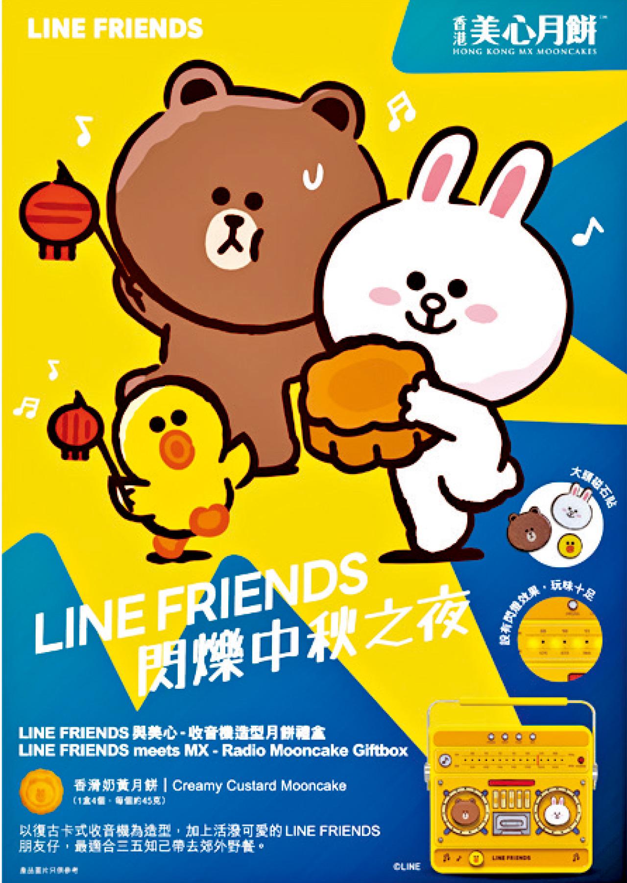 LINE FRIENDS再度與美心推出中秋月餅禮盒,今年禮盒設計玩味十足,以復古卡式收音機為造型,每個月餅上均印有LINE FRIENDS BROWN頭像,而禮盒設有閃燈效果,盒身上的BROWN、CONY及SALLY更可從罐面取出,變身成為磁石貼,極具收藏價值!