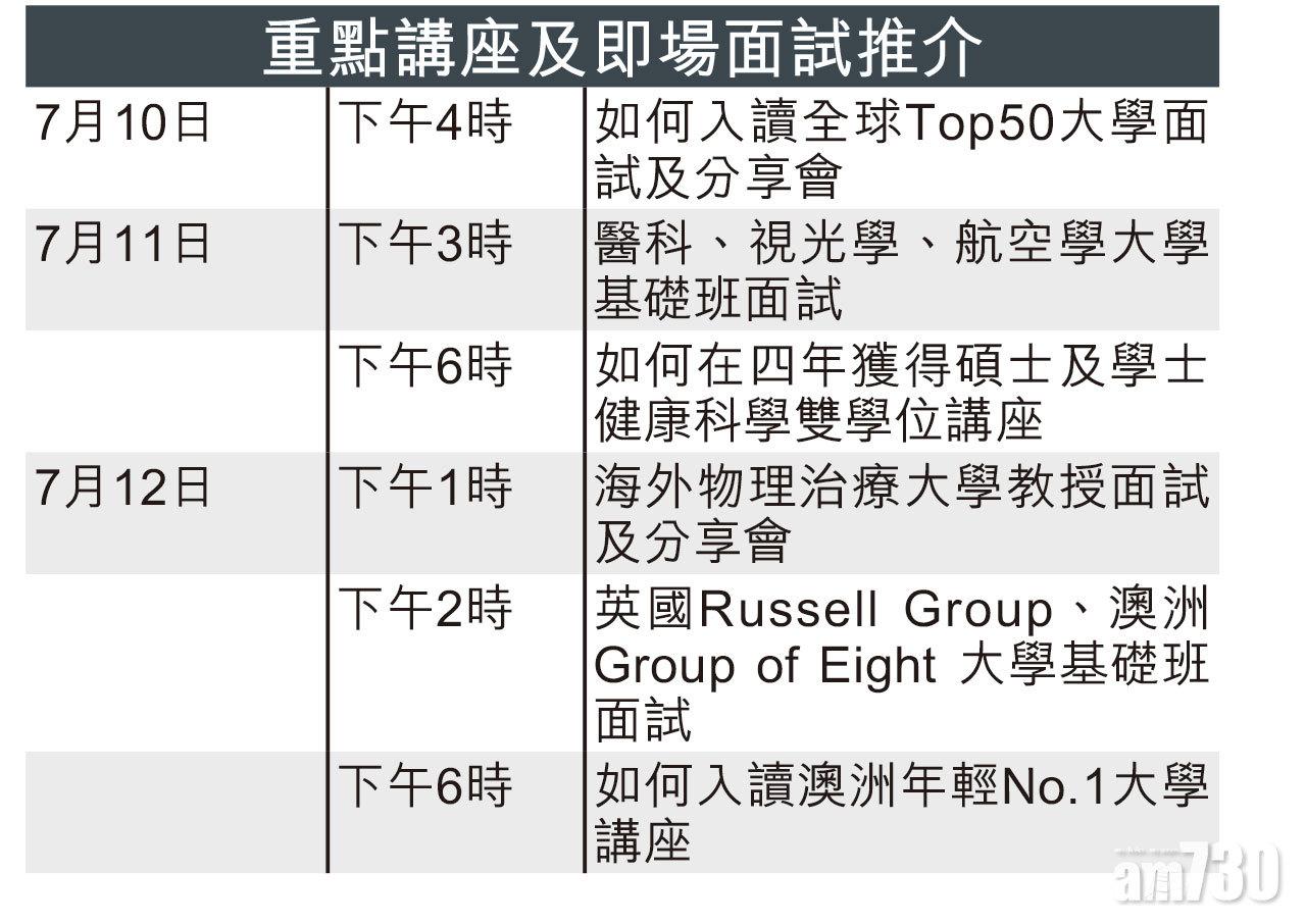 AAC升學顧問鄧偉强指,外國院校設備及配套完善,開辦的專業多不勝數。有見及此,AAC由今日起舉辦多個專題講座,包括:健康專科諮詢日及講座、分析如何入讀全球百大大學、比較學位、文憑及基礎課程的分別,入學要求及費用等,還特別設有即場面試。AAC的每位升學顧問擁有最少十多年以上的經驗,致力按每位同學的興趣、能力及背景作詳細分析,從而度身制訂最合適學生的升學計劃,費用全免。經由AAC出國升學的同學大部可成功入讀心儀學府及專業,不少更取得獎學金。學生如欲進一步了解海外升學的詳細資料,歡迎預約查詢,並帶同公開考試及最近兩年校內成績可獲優先面試機會。