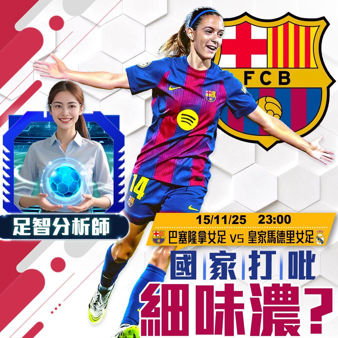 巴塞女足雖然是國內擂台躉,聯賽主場5戰全勝入24球,平均每場入4.8球;但其中兩勝弱旅已共入16球,計對上3場聯賽主場2次只小勝2:0。始終皇馬女足前鋒好手多,包括3大西班牙國腳在陣,其中列當度在上次交手打敗巴塞女足更先開紀錄,她在季內腳風亦順,巴塞守將不會掉以輕心,今場戰情未必一面倒,可博巴塞小勝。