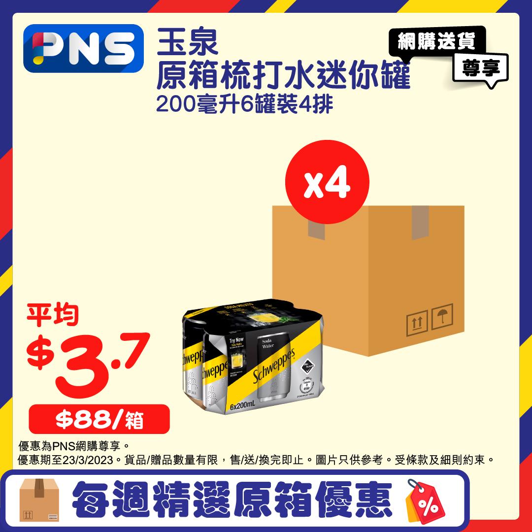 玉泉梳打水迷你罐200毫升6罐裝4排,$88/箱;