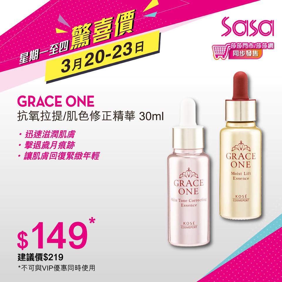莎莎今期驚喜價有GRACE ONE抗氧拉提/肌色修正精華 30ml $149/件、GATSBY潔面膏系列限定增量裝 $22.9/件、50惠男士育髮激活精華/黑髮激活精華$348/$373/件,助你保持完美面貌!