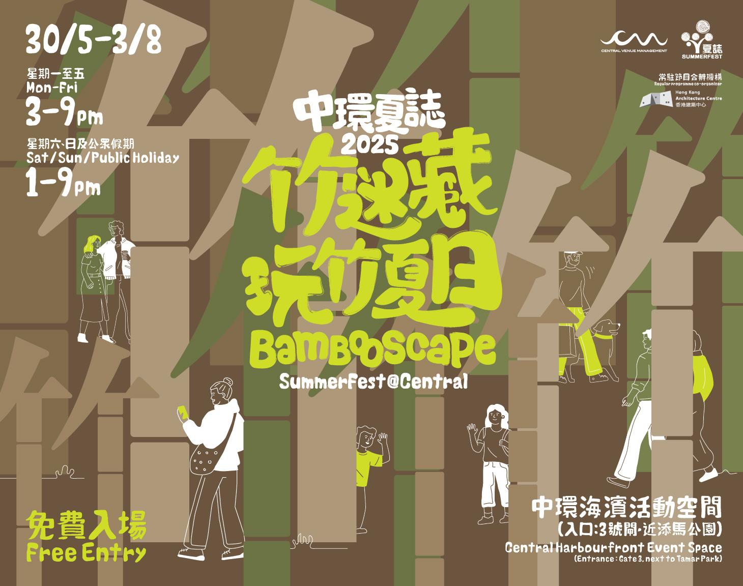 中環年度節目,第九屆SummerFest 中環夏誌將於5月30日至8月3日於中環海濱活動空間舉行,為期66天的免費活動,集多達25項活動,集文化、音樂、舞蹈、運動於一身。今年更首度推出常駐節目「竹迷藏」,以香港傳統竹棚技藝為靈感,打造六件大型竹藝裝置,帶來精彩暑假節目,即睇詳請。