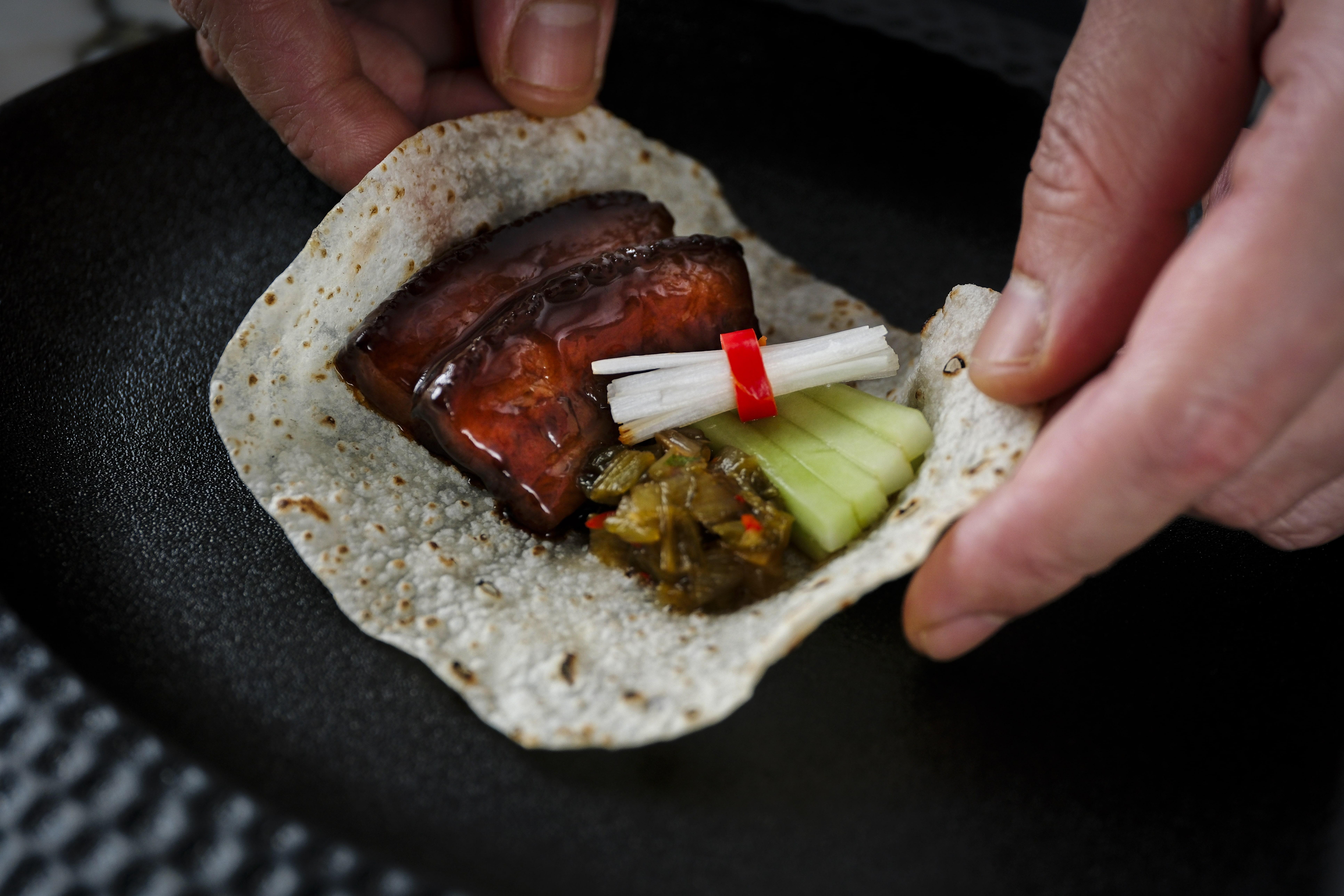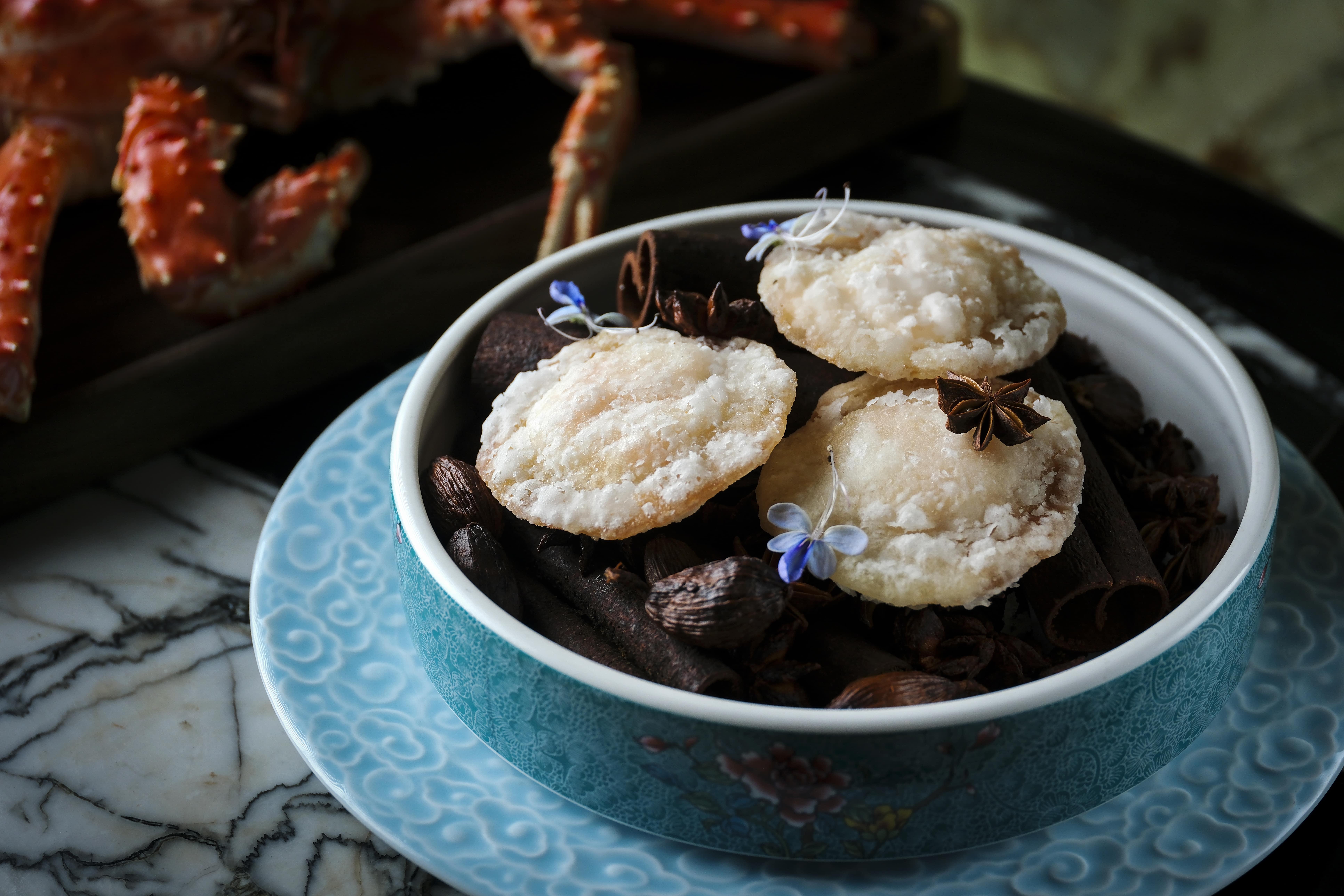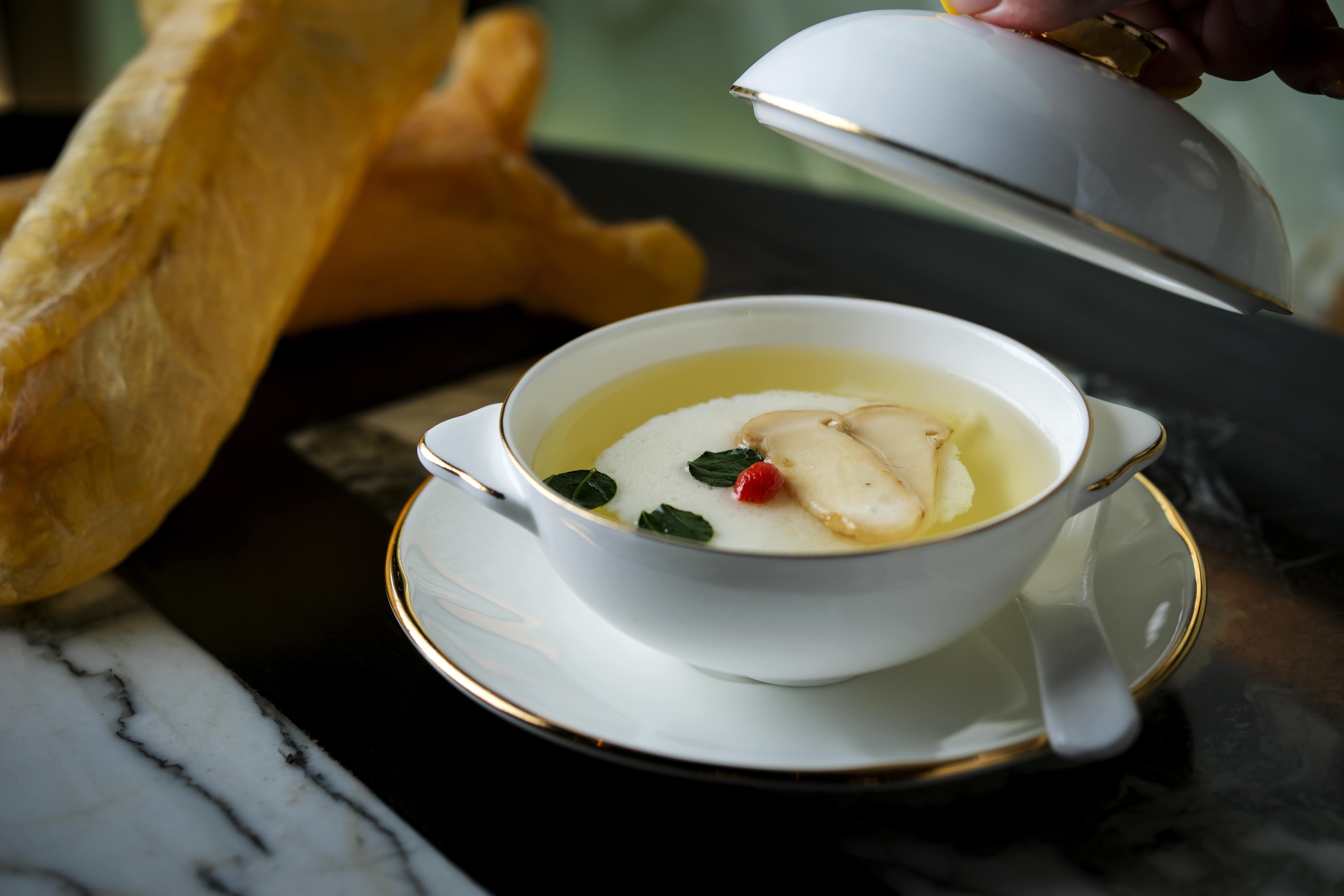「水照影」首先登場,選取現時當造的西班牙紅蝦,蝦肉煮至半熟彈牙鮮甜,配上薄薄的冬瓜片,提升清爽感,加入自家製青檸葉油連繫整道菜式,醬汁充滿熱帶風味,在炎夏之中特別開胃。而開胃菜「鮮松茸雲霧帶子燉花膠」則用上風味鮮美的「菌中之王」松茸炮製,並以雞湯及花膠燉製六小時,湯頭清澈又清甜。師傅另將帶子與蛋白巧妙混合,用清湯低溫浸熟,把燉湯中的帶子以雲朵般的形態呈現,令人回味無窮。「香酥雪燕阿拉斯加蟹盒」以世界四大名菌之一的羊肚菌作餡,配上彈牙的雪燕、鮮甜的阿拉斯加蟹肉、爽口的馬蹄,清香的芫荽,以及充滿鹹香而且十分罕見的諾鄧火腿,口感細緻而且味道紛陳。