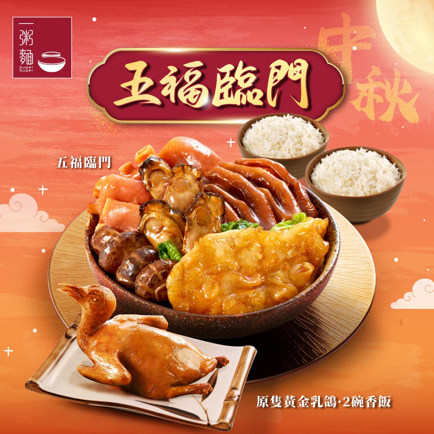 一粥麵另有推出適合二人小家庭享用的節慶菜「五福臨門」(原價$198,早鳥優惠送$20一粥麵現金券),用上5款高級食材入饌,包括:滋補紅燒花膠、鮮味韓國蠔豉、古法扣鴨掌、肥美南乳豬手、蠔皇花菇等,非常吸引!套餐更有兩款風味配搭,包括:香脆黃金乳鴿及2碗香飯;或香口又用料豐富的揚州炒飯。由即日起至9月5日前經一粥麵網站或分店訂購即送$20一粥麵現金券,價值超值!