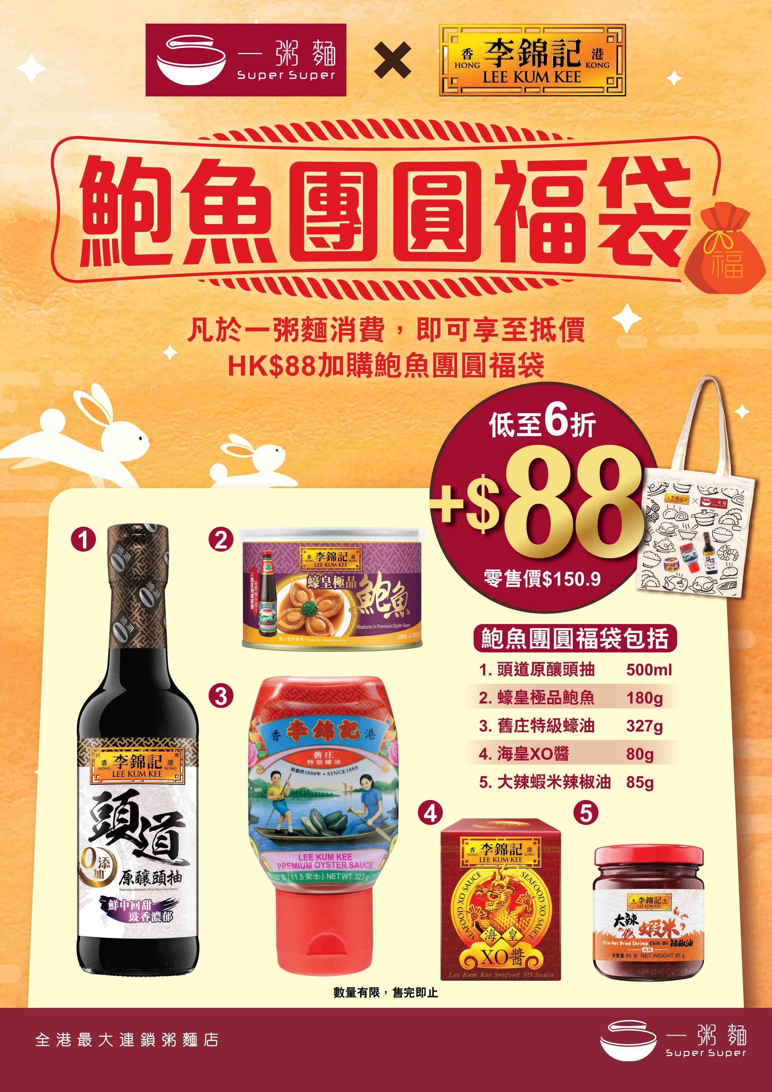 由9月3日起,凡於一粥麵預訂盆菜或作任何消費,大家即可以至抵價$88換購一粥麵x李錦記鮑魚團圓福袋,優惠低至6折!每個福袋內容豐富,包括:細滑醇厚的特級蠔油、頂級原釀頭抽、肥美鮮甜的蠔皇極品鮑魚、麻香刺激的蝦米辣椒油,以及香甜惹味的海皇XO醬。