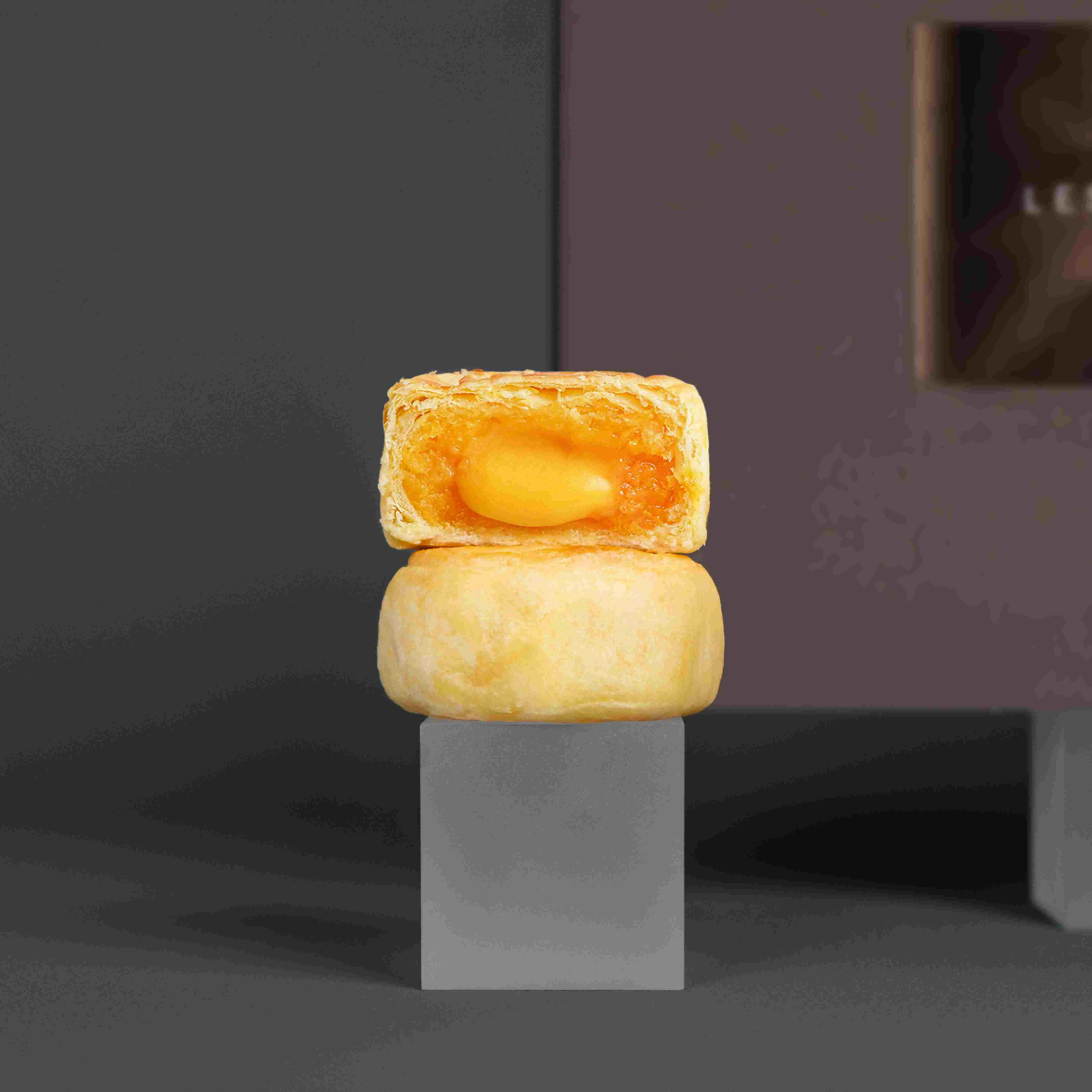 一盒4個,其琥珀橘盒映徹燈輝,復古風采猶存,配以雕鏤剔透的窗框,宛如隙見星辰燁燁,皎潔明暉灑落。選用傳統配方及上等材料炮製,以頂級蓮子製成細滑白蓮蓉,配上原個金香鹹蛋黃以及純正花生油,傳統工藝烘焙,入口甘香軟滑,清甜不膩。
