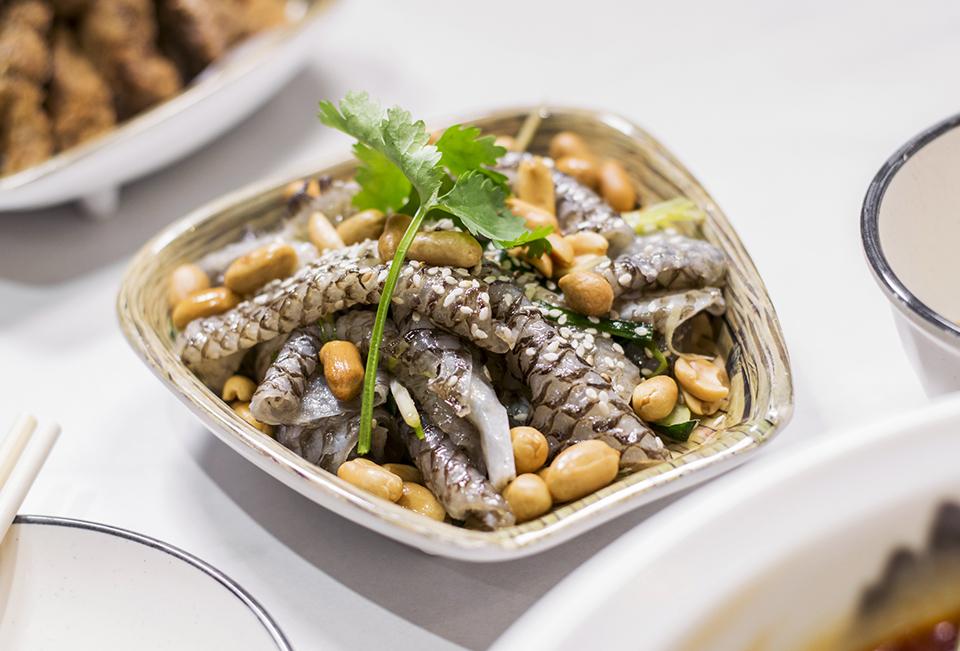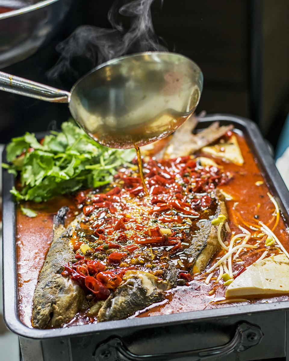 小店「川公館」,名字有個川字,總廚譚先生說餐廳菜色以川菜為基礎,再加入新意。像招牌烤魚,一共六款,四款辣兩款不辣,不把重點放在「辣」字上,而是以不同食材襯托出不同風味的烤魚。最受街坊歡迎的「重慶豆花烤魚」,原條足斤半重的魚,放在烤魚箱,高溫烤十分鐘,湯底以魚湯撞豆瓣醬及香料再煮。魚身鋪滿大小不同辣椒粒,上枱前灒一勺滾油,滋滋作響迫出辣勁。