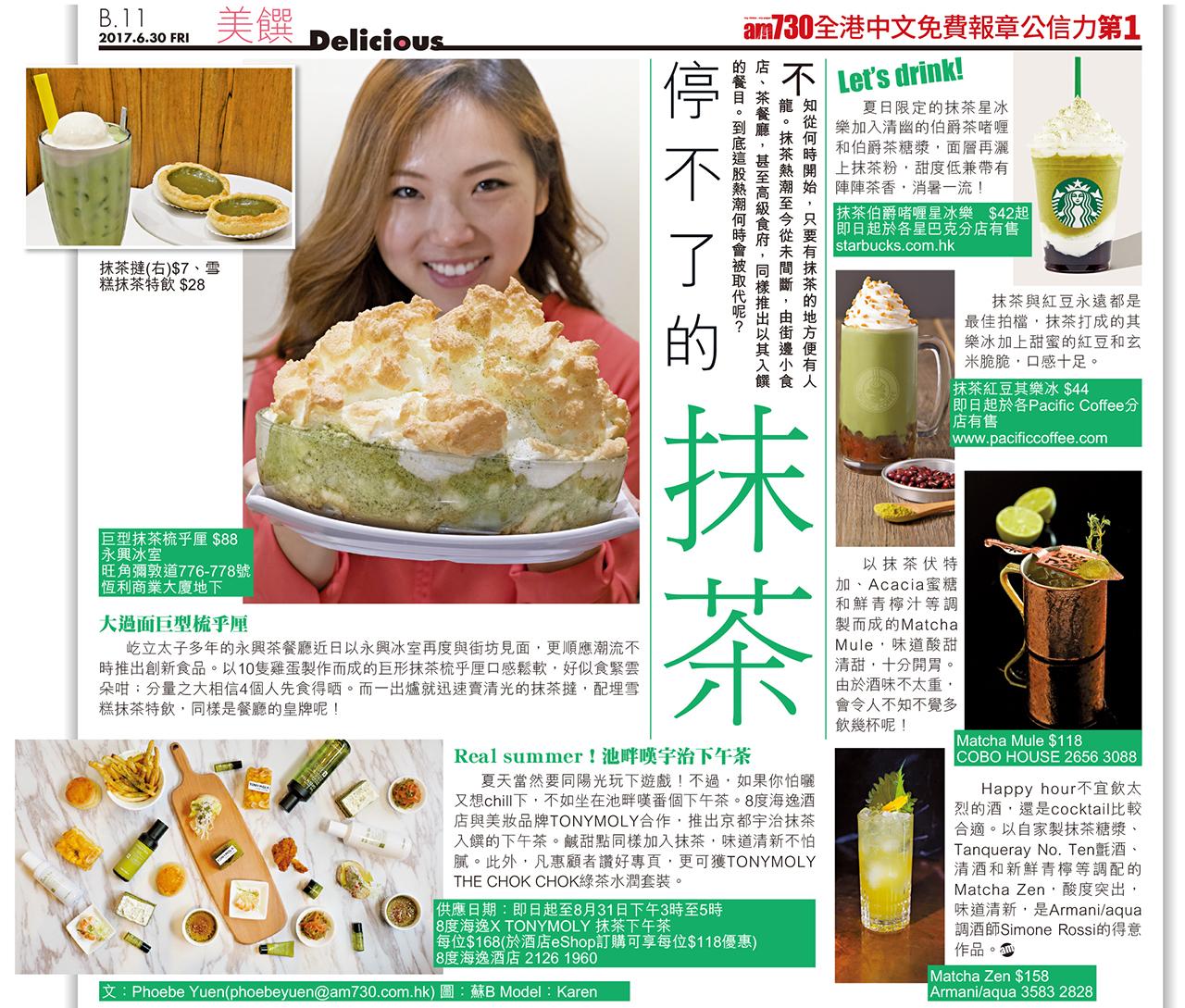 夏天當然要同陽光玩下遊戲!不過,如果你怕曬又想chill下,不如坐在池畔嘆番個下午茶。8度海逸酒店與美妝品牌TONYMOLY合作,推出京都宇治抹茶入饌的下午茶。鹹甜點同樣加入抹茶,味道清新不怕膩。此外,凡惠顧者讚好專頁,更可獲TONYMOLY THE CHOK CHOK綠茶水潤套裝。