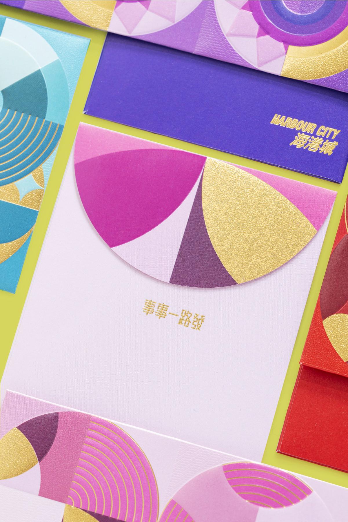 海港城今年以寓意「發」的吉祥數字8為創作概念,設計出6款絢麗雅致的利是封,利是封分別在紅、橙、黃、紫、粉紅、和湖水綠的主色上綴以金色,拼湊成賀年數字組合888、28、338、128、168及18,送上包括「發發發」、「人人身心發」、及「齊齊易發」等祝願,寓意新一年「蛇」來運到,事事一路發!顧客消費滿HKD2000及向香港血癌基金捐款HKD50,即可換領1套利是封。
