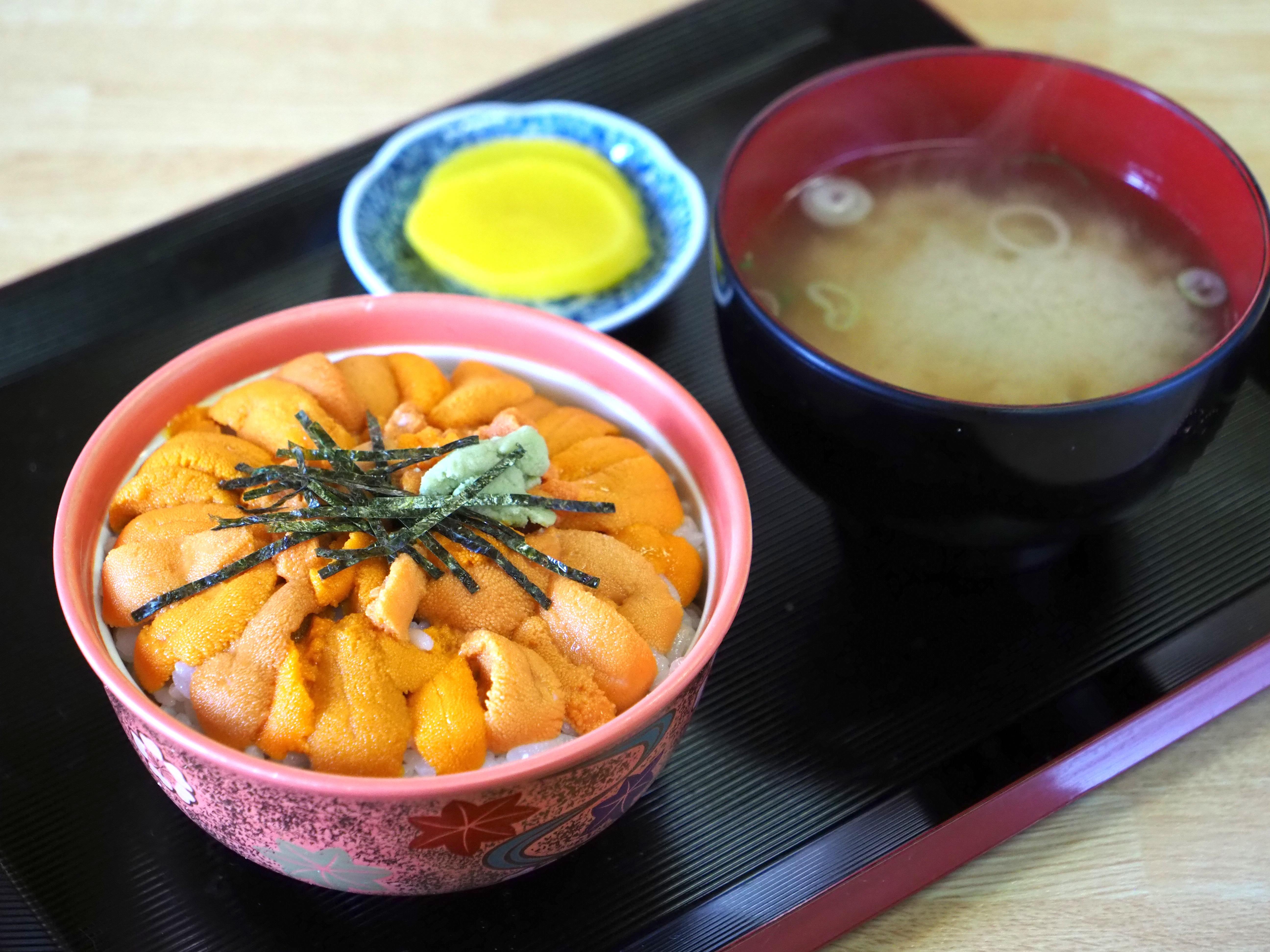 島上最著名的海膽食堂,是位於利尻島沓形港附近的「大漁亭」,明治41年(1908年)創業,招牌名物「土瓶蒸海膽」,以利尻昆布煮成的高湯來蒸海膽,口感比生海膽略為結實,但味道更濃郁甘甜。蒸海膽可以拌飯吃,還可以做成海膽茶泡飯,味道更優雅,據說明仁天皇的弟弟吃過也讚口不絕!