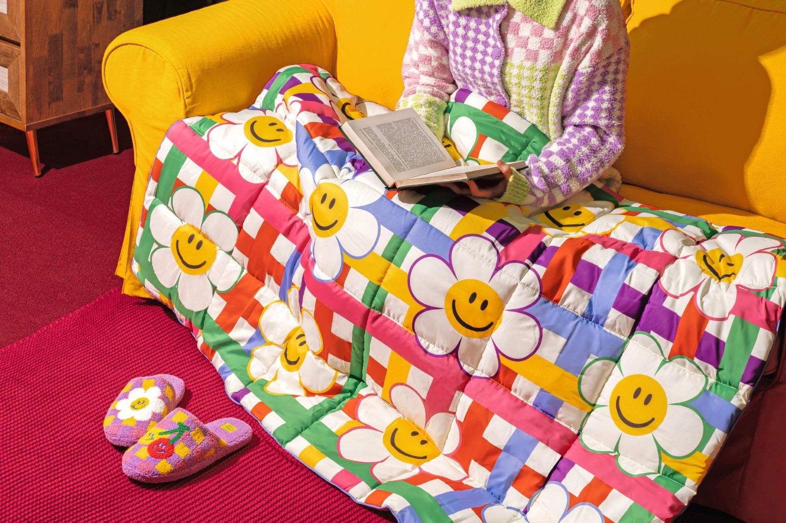 wiggle wiggle Joyous Flower World 棉氈同樣以標誌性的微笑花花為主設計,每朵小花都有不同顏色,背景有由彩色間條所組成的格子圖案,一年四季都合用,可愛又實用。