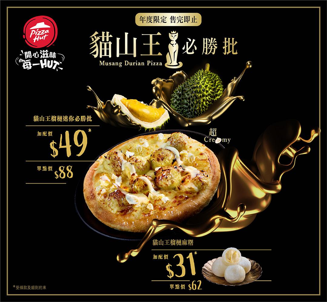 Pizza Hut 再次為廣大榴槤迷謀福利,推出期間限定「貓山王榴槤迷你必勝批」*,今年特別精選風味濃郁的貓山王品種製作薄餅,還新加入透心涼「貓山王榴槤麻糬」為榴槤大餐完美作結。產自 馬來西亞的D197貓山王貴為榴槤界的王者,以甜中帶甘、飽滿果肉和奶油般柔滑的口感而聞名, 每份薄餅皆有 8 球貓山王榴槤果肉球,再鋪滿貓山王榴槤吉士醬,加上粒粒榴槤乾,直擊嗅覺和味蕾的「榴槤三重奏」令人猶如置身貓山王榴槤海洋中,享受頂級美味的貓山王榴槤,叫各位 「榴槤控」為之瘋狂!是次期間限定「貓山王榴槤迷你必勝批」*加配優惠只售$49 起^,另可以 超值價$31 加配^「貓山王榴槤麻糬」,以超值價錢享受頂級榴槤,「一件不榴」!