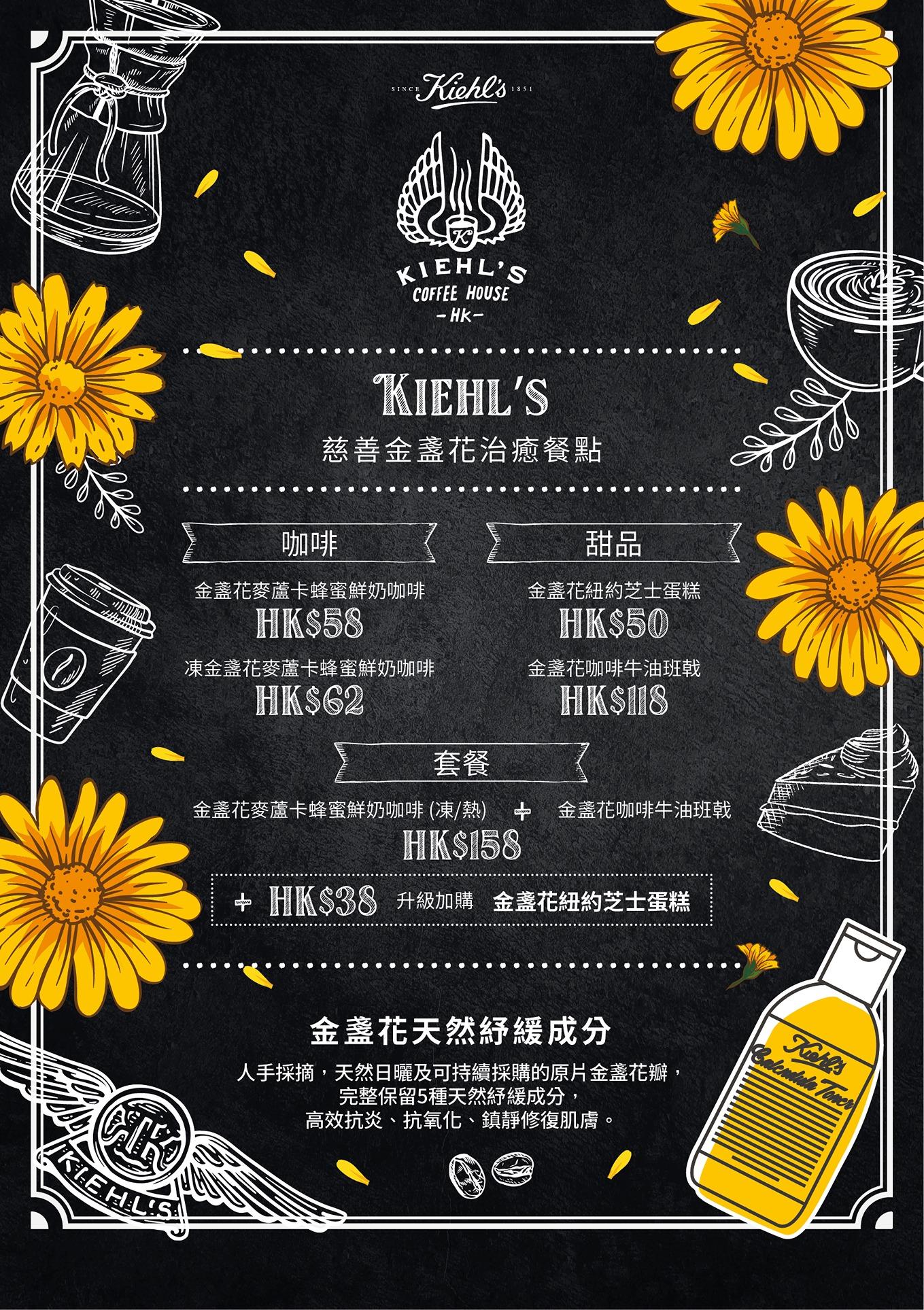 Kiehl’s兩年多前在台灣開設「Kiehl’s Coffee House」,成為當地的「打卡」熱點。今年更首次空降尖沙咀海港城,由即日起至8月31日開業,為期約一個月,讓 Kiehl’s 粉絲及公眾一同享受金盞花咖啡美食之餘,更認識金盞花的治癒功效,同時支持這個有意義的慈善企劃。