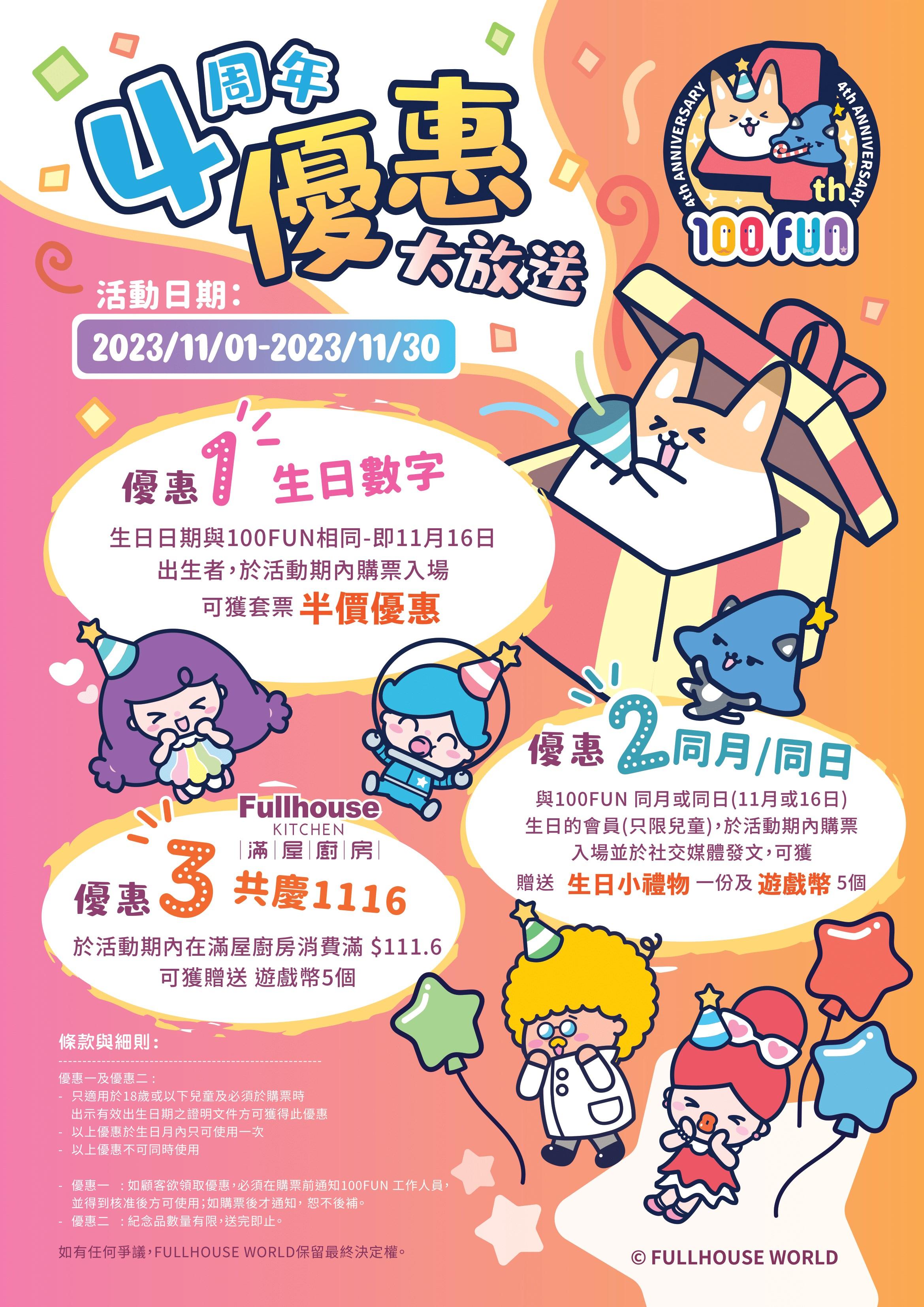 「100FUN 樂滿紛」為慶祝四週年,特意推出一系列相關香港交通工具主題的園區小遊戲 (小小任務)及場內有獎快閃遊戲,嘉年華區內的夾公仔機亦會換上相關新禮品;小食區則會推出特式配套,當中包括 經典紅豆冰、美祿 Oreo 恐龍等懷舊飲品,亦有不少茶餐廳內已絕跡的黑牛;雞蛋仔小食方面則有奶醬及阿華田煉奶,雪糕紅豆等經典口味,香港情懷滿分。