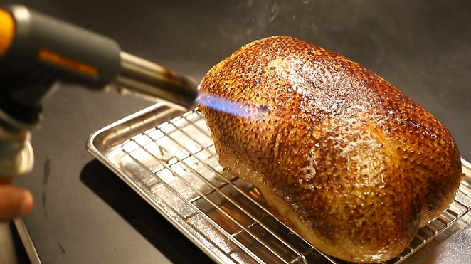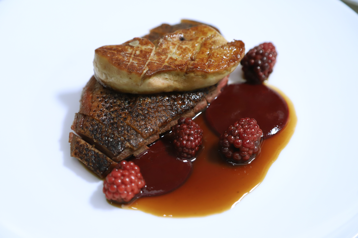 Russell一直奉行「Less is more」的創作原則,因此Jimmy’s Kitchen更著重食材的質素:「優質的食材不需要繁複的調味,大部分的菜式我們只會配搭一到兩種配菜和汁醬。」正如新菜式14天熟成鴨胸便是最好的例子:選用來自法國的全鴨,先把腿翼去掉,再熟成14天令其風味更突岀,然後便用火槍把鴨皮燒脆並染上煙燻的味道。整個過程Russell只以海鹽作調味,煎的時候便要用鐵板壓實,以免鴨胸收縮。最後便會配上自家醃製的黑莓和馬德拉酒醬汁,以自然的果酸味平衡鴨胸和鵝肝的油脂。雖然調味上看似簡單,但看完整個製作過程才知道一步都不能馬虎。