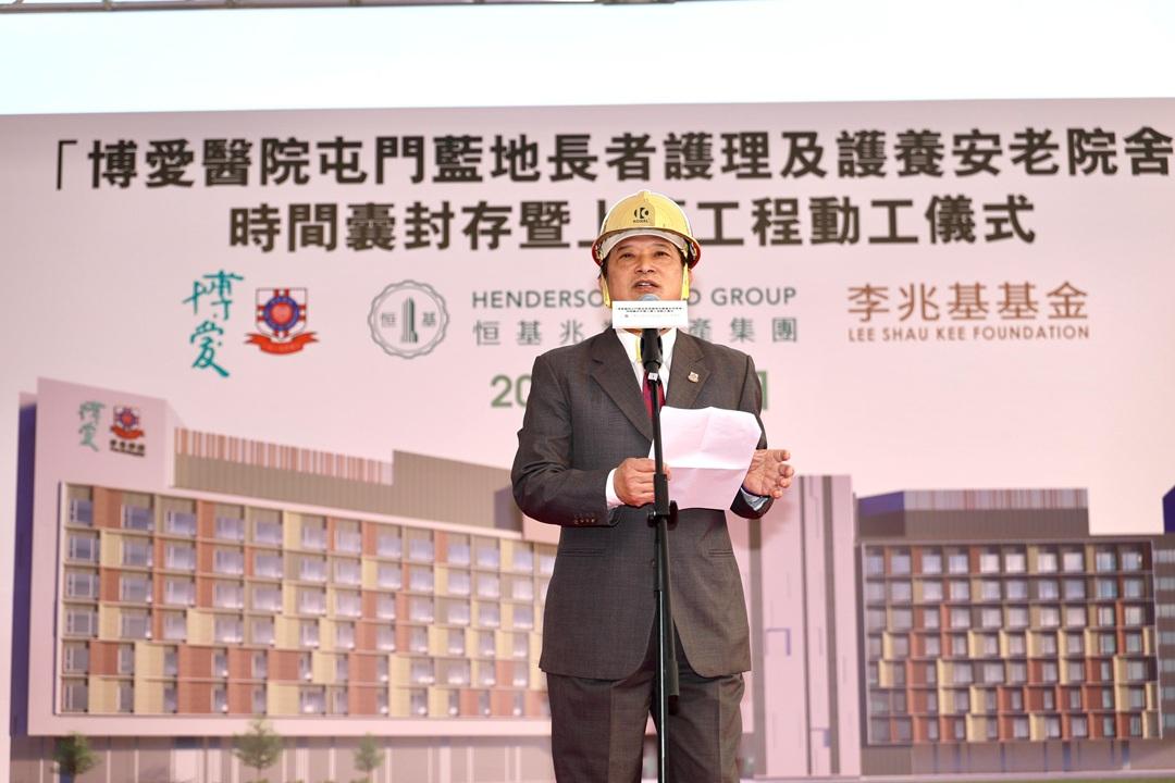 博愛醫院董事局主席周駿達先生感謝各界嘉賓的出席,共同見證盛事,並感謝各政府部門及持份者的貢獻,指出由規劃、建造到之後落成,藍地安老院舍項目體現到政、商、民三方協作的成果,應對社會對安老支援的龐大需求。周主席感謝李兆基基金支持藍地安老院舍未來營運,將與博愛醫院共同成立慈善基金,並委派代表出任基金主席,惠澤更廣大市民。對於這一份代代相傳的慈善家精神,表示由衷尊敬。在接下來的日子,博愛團隊將不負所望,致力與政府各部門、商界友好伙伴共同努力推進項目。