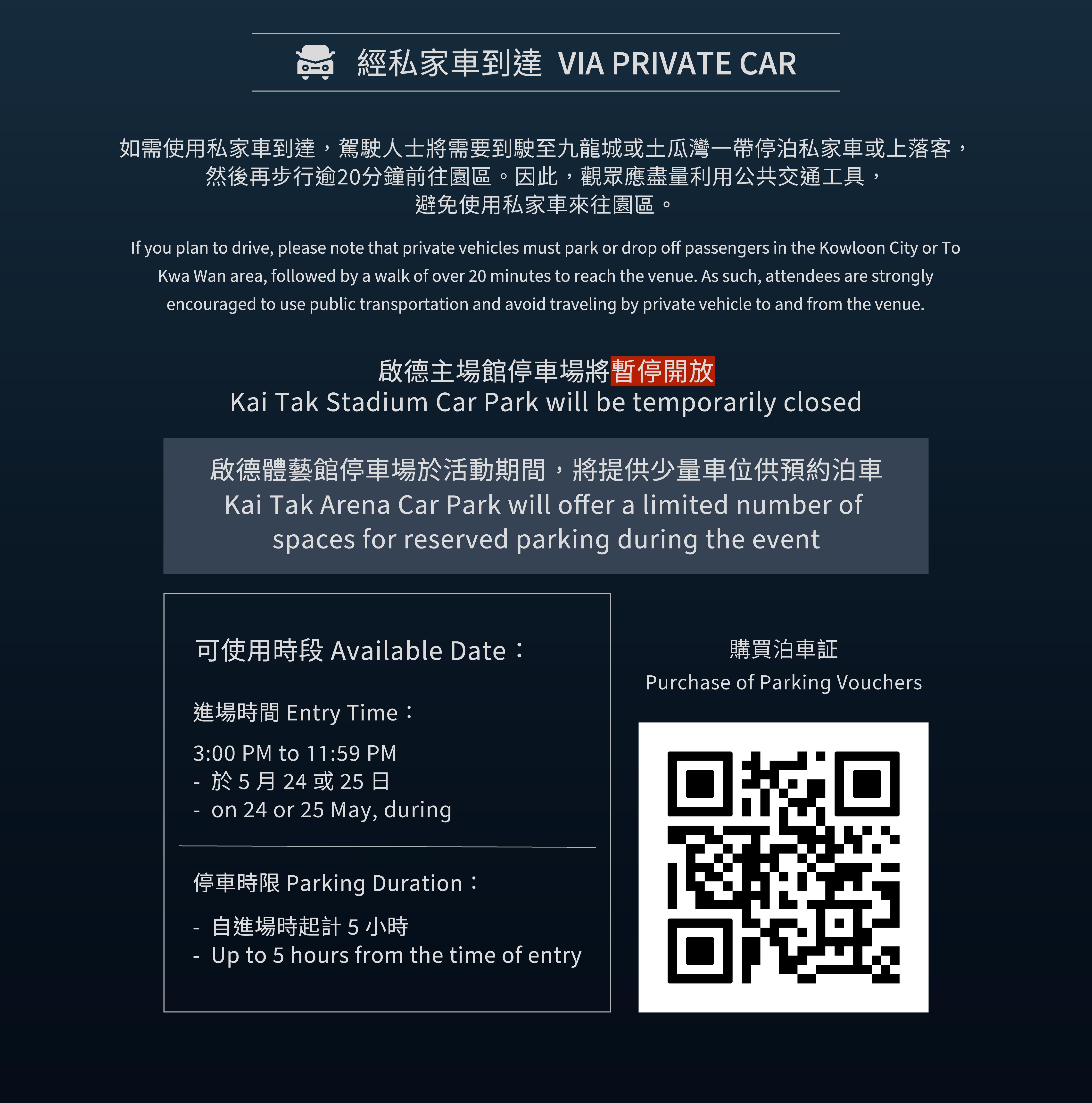 - 觀眾年齡及身高限制:企位區只限12歲或以上且身高不少於 140厘米 之人士。坐位區只限 3歲或以上人士。