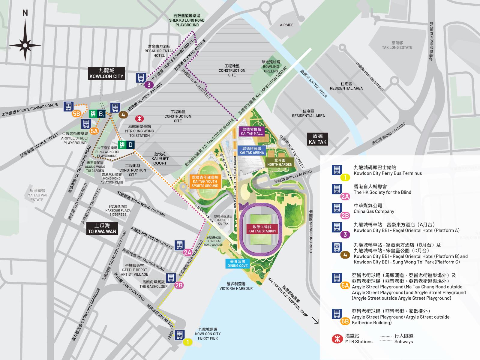 - 啟德體育園場內場外均為嚴禁吸煙,只有在大型活動舉辦期間,才可以前往場館外的「指定吸煙區」吸煙