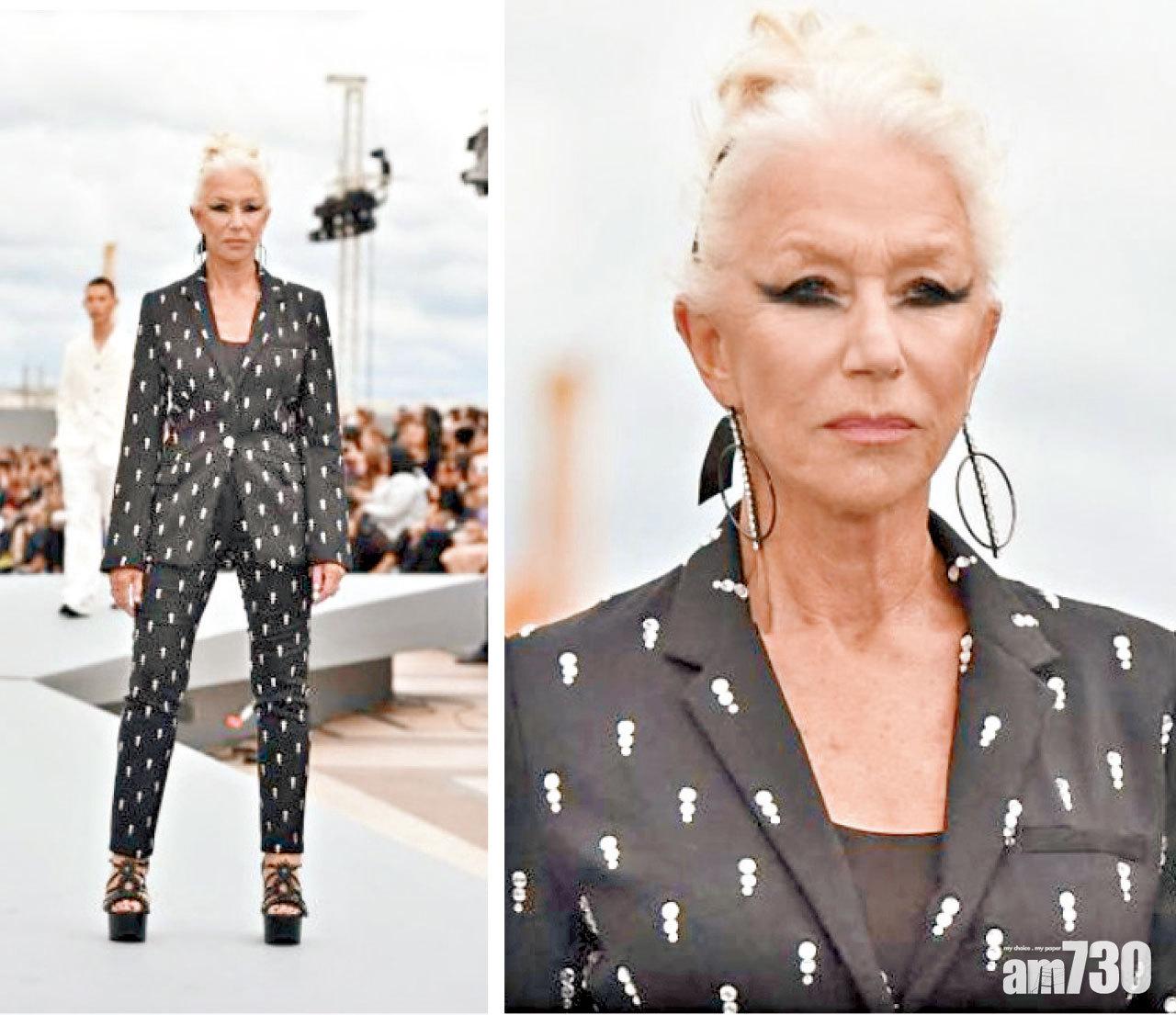 英國76歲女星海倫美雲(Helen Mirren)日前於巴黎時裝周騷為L’Oréal Paris行騷。雖然一頭白髮、滿臉皺紋,但她狂野不羈的黑色眼妝配黑西裝與鬆高鞋,霸氣十足,搶走超模與明星的風頭。(互聯網)