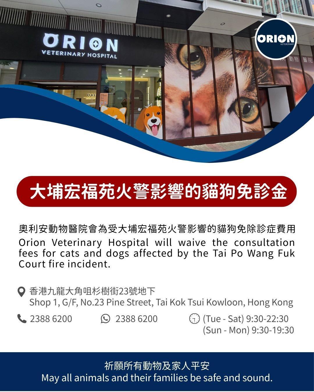 除了愛協提供貓狗救援之外,奧利安動物醫院亦宣佈為受火災影響的大埔宏福苑貓狗免除診症費用,如有需要的寵物主人可前往奧利安動物醫院。