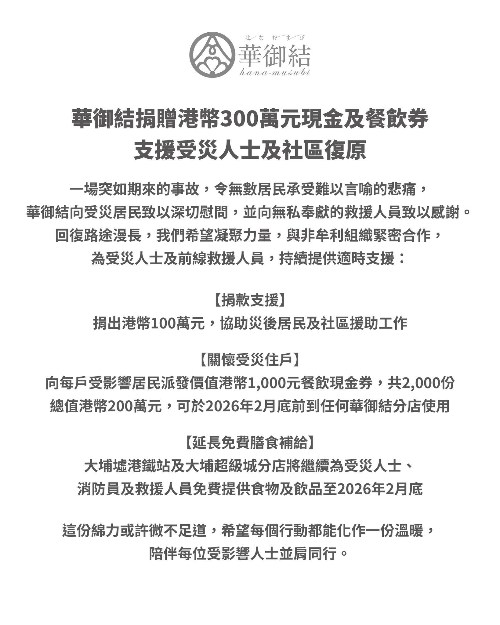 華御結昨晚於網上平台表示,一場突如期來的事故令無數居民承受悲痛,回復路途漫長,他們希望凝聚力量,與非牟利組織合作,為受災人士及前線救援人員持續提供適時支援。華御結捐出港幣100萬元,協助災後居民及社區援助工作。並向每戶受影響居民派發價值港幣1,000元餐飲現金券,共2,000份總值港幣200萬元,可於2026年2月底前到任何華御結分店使用。此外,大埔墟港鐵站及大埔超級城分店將繼續為受災人士、消防員及救援人員免費提供食物及飲品至2026年2月底。帖文提到「這份綿力或許微不足道,希望每個行動都能化作一份溫暖,陪伴每位受影響人士並肩同行。」