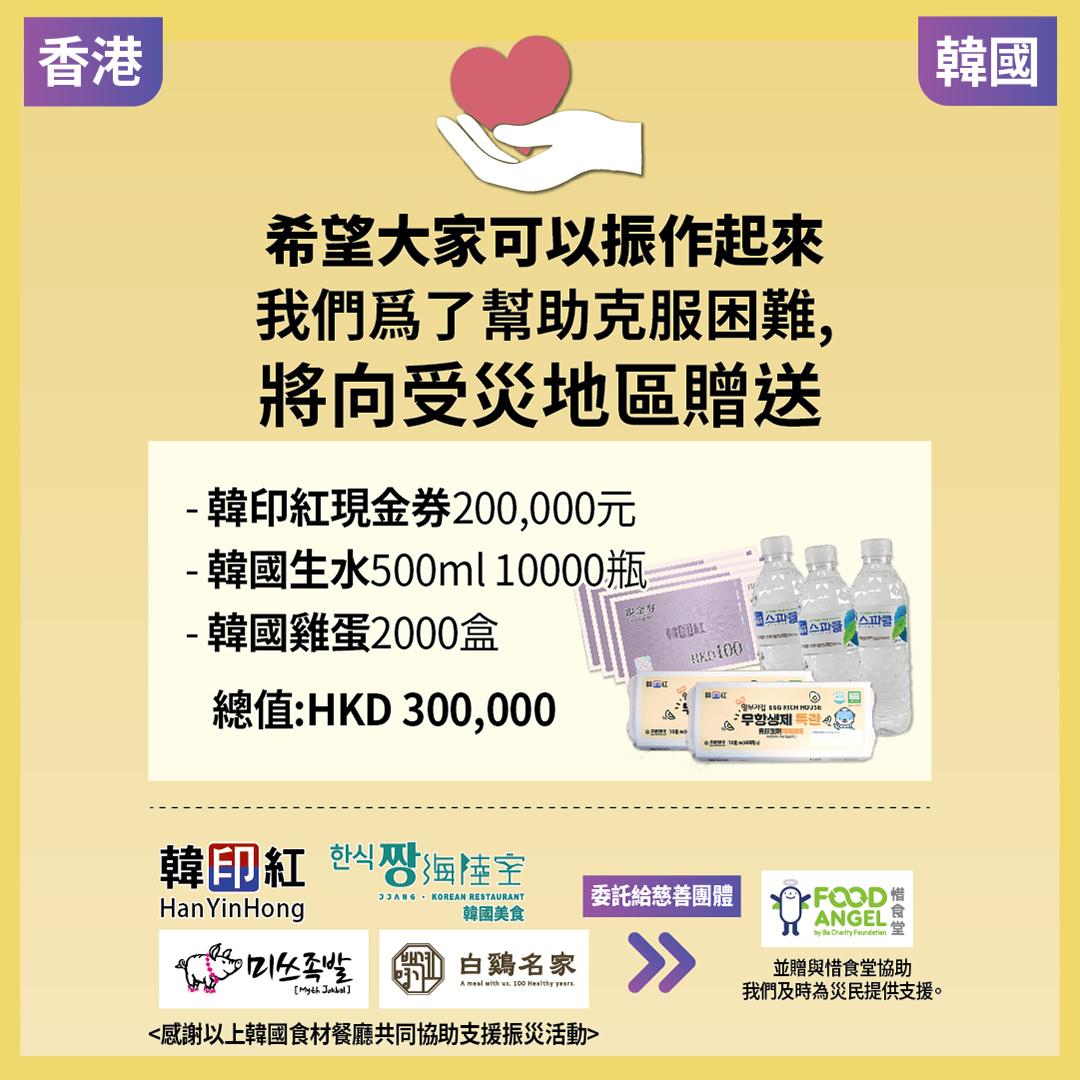 韓印紅透過網上平台表示出一份力支援賑災,贈送韓印紅現金券200,000元、韓國水(500ml)10000瓶及韓國雞蛋2000盒,總值港幣$300,000,贈予惜食堂協助災民提供支援,當中聯同幾間韓國餐廳共同協助支援。「希望大家可以振作起來!」