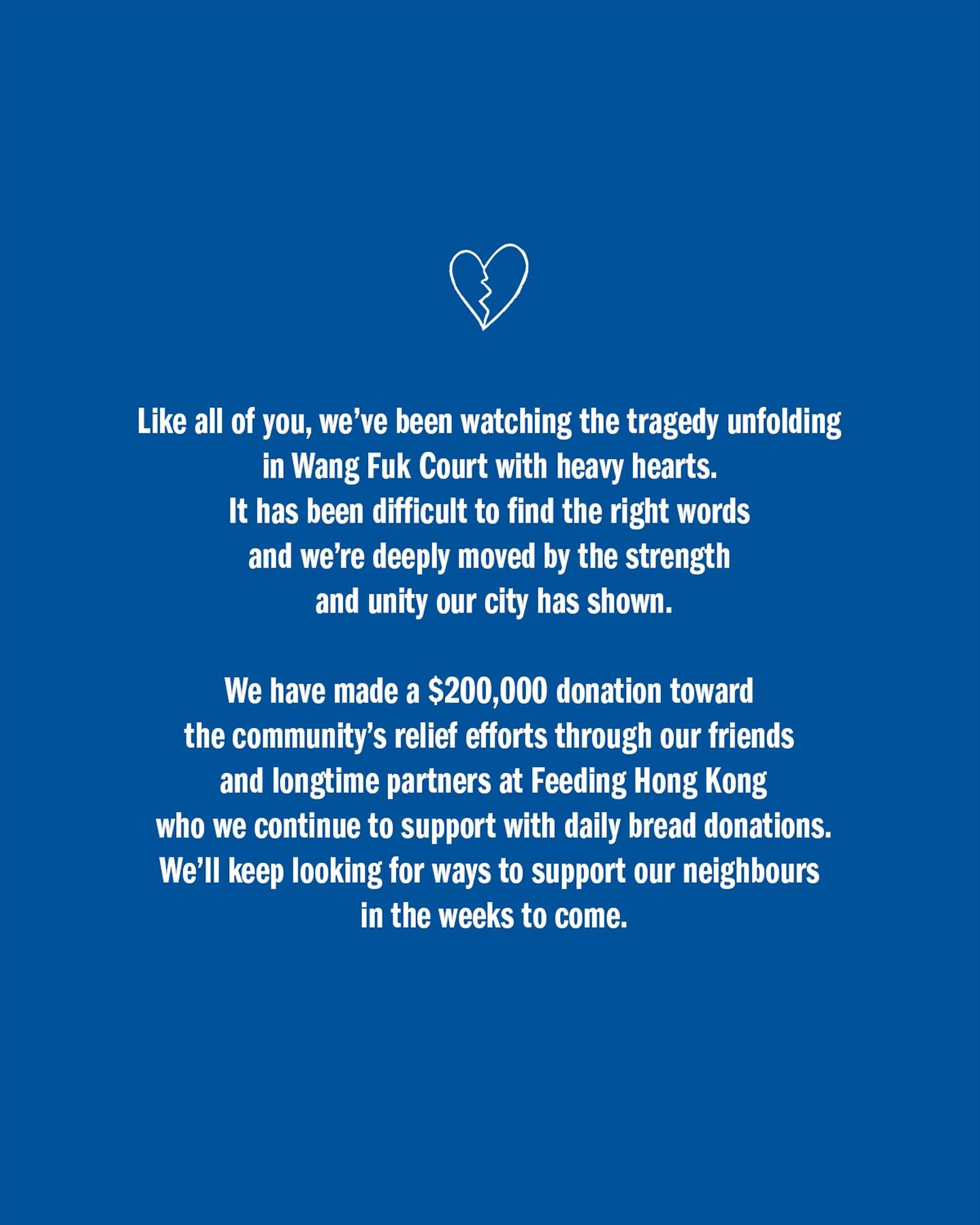 Bakehouse昨晚透過社交平台表示:「就像你們所有人一樣,我們一直懷著沉重、難以言喻的心情關注著宏福苑發生的悲劇,我們對這個城市展現出的力量和團結深受感動。我們已透過朋友和長期合作夥伴「樂餉社Feeding Hong Kong」向社區救援工作捐款$200,000,並會繼續每日捐贈麵包。在接下來的幾周裡,我們將繼續尋找支持鄰舍的方法。」原來Bakehouse一直低調捐贈麵包,2024年總共捐贈了110,852份食物,而且秉承社區小店的宗旨,不時會參與做義工。