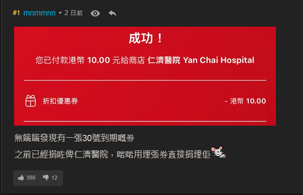 這名網民日前在討論區發文分享,表示在PayMe手機應用程式中,「無端端發現有一張30號到期嘅券」,由於他早前曾向仁濟醫院捐款以支援大埔宏福苑火災災民,於是決定「用埋張券直接捐埋佢」,並上載圖片證明成功將$10款項支付給仁濟醫院。