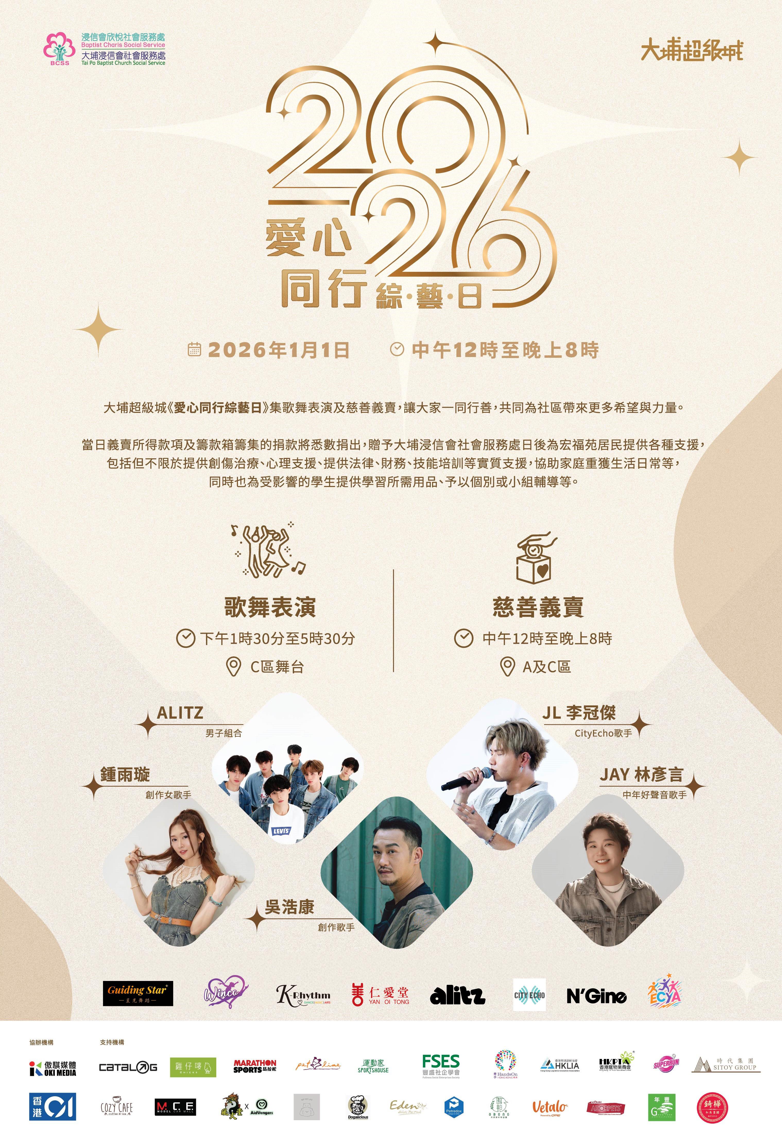 大埔宏福苑五級火摧毀無數人的家園及家庭。大埔超級城攜手大埔浸信會社會服務處於2026年1月1日元旦舉行愛心同行綜藝日。當日不但設慈善義賣市集,更設不同表演,為大埔區居民打氣!