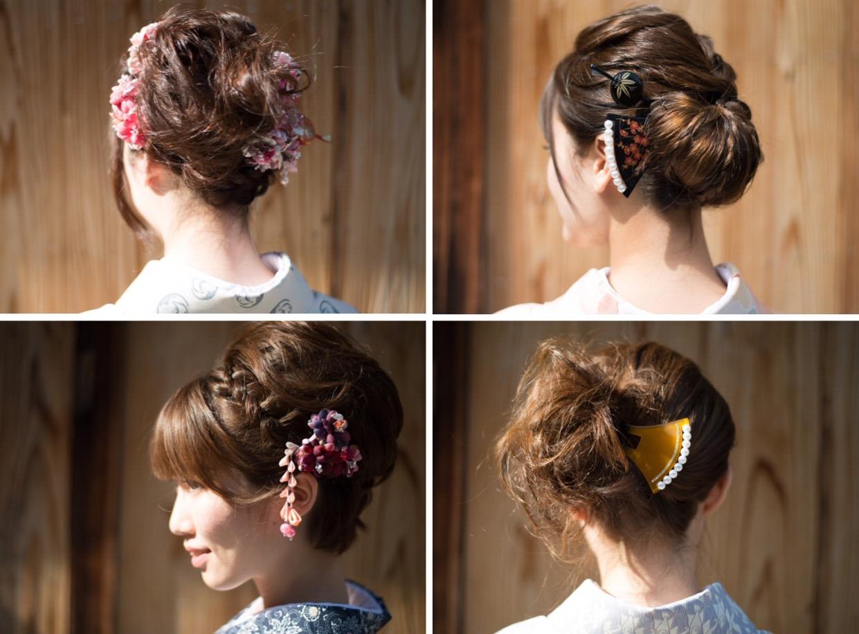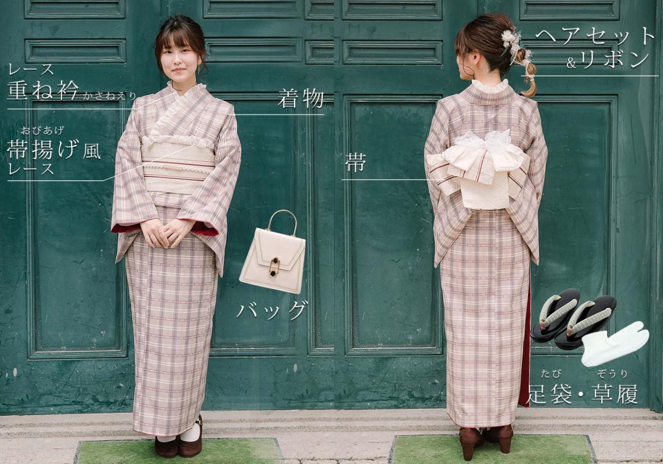 蕾絲裝飾搭配和服・浴衣租借:和服/浴衣、蕾絲裝飾、腰帶、二趾襪、草履鞋 、日式提包、髮型設計八選一(包含髮型用絲帶)。