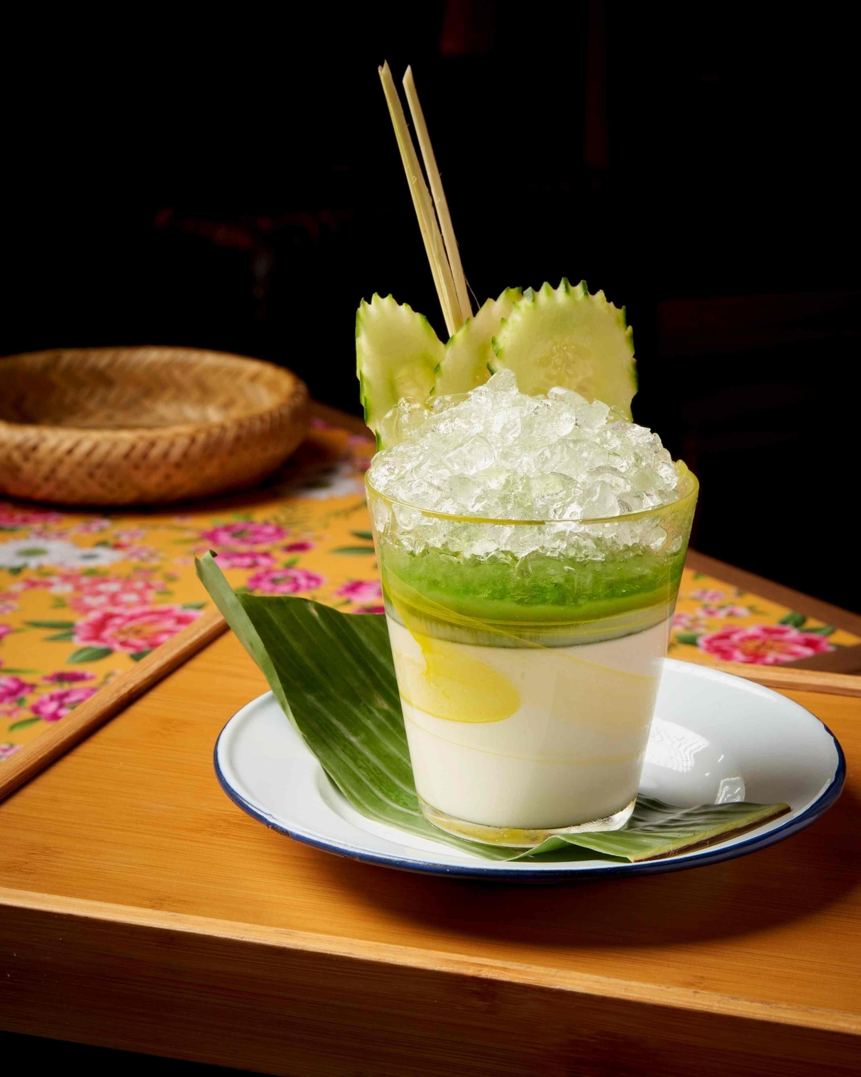 飯後甜點少不了泰式芒果糯米飯($58)及芒果楊枝甘露($48),特別推介特式香茅奶凍($78),底 層是由忌廉及香茅巧製的奶凍,中間是青瓜及青檸製成的啫喱,面層鋪上由青檸及青檸皮打成的沙冰,香滑中帶清爽,每個層次都洋溢芳香滋味。餐廳亦有多款融入東南亞風味、以香蘭葉、椰子、青檸等調製的雞尾酒及益力多沙冰等無酒精飲品;其中一款 Tom Yum($65)就是參照經典泰國菜餚冬蔭功的食譜,由卡菲爾青檸氈酒、香茅糖漿、青檸及泰國辣椒調製而成;另外亦有用上泰式奶茶巧製的特式飲品。
