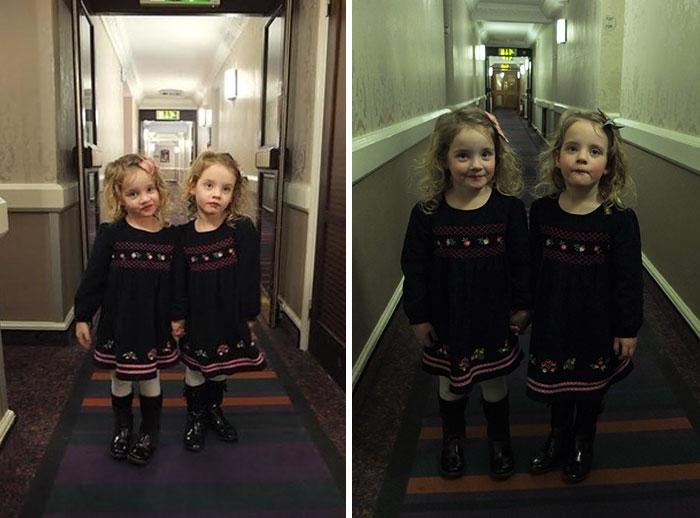 Martin Hughes帶同全家去倫敦度假,入住一間酒店時,心血來潮搵自己對4 歲雙孖女,模仿經典電影《閃靈》場面,拍咗張令人毛骨悚然嘅照片,上傳Twitter後引起網友熱烈討論。