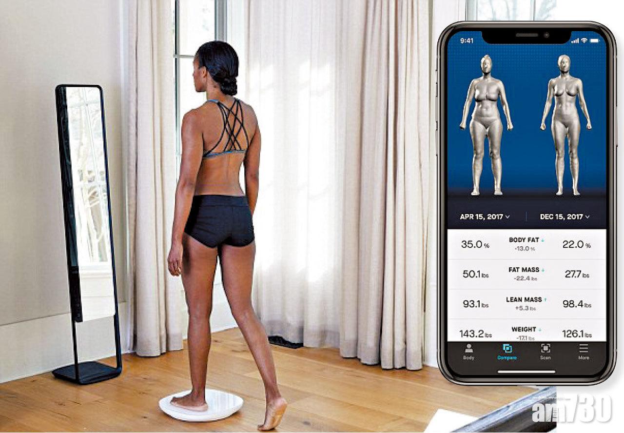 喼弗癡最愛鋪相晒美肌,更pro者可考慮使用這面可照出3D胴體的魔鏡及裸磅(大圖)。掃描紀錄全儲存到手機App,並分析比較健美進程,包括身體脂肪比例、脂肪量、肌肉量、體圍及體重等前後轉變(小圖),從而修訂健身方針;影像化的成果,亦有助加強鍛煉意志。此喼弗神器發明者是矽谷Naked Labs,價錢亦反映出有多pro:售約1萬港元。 (互聯網)