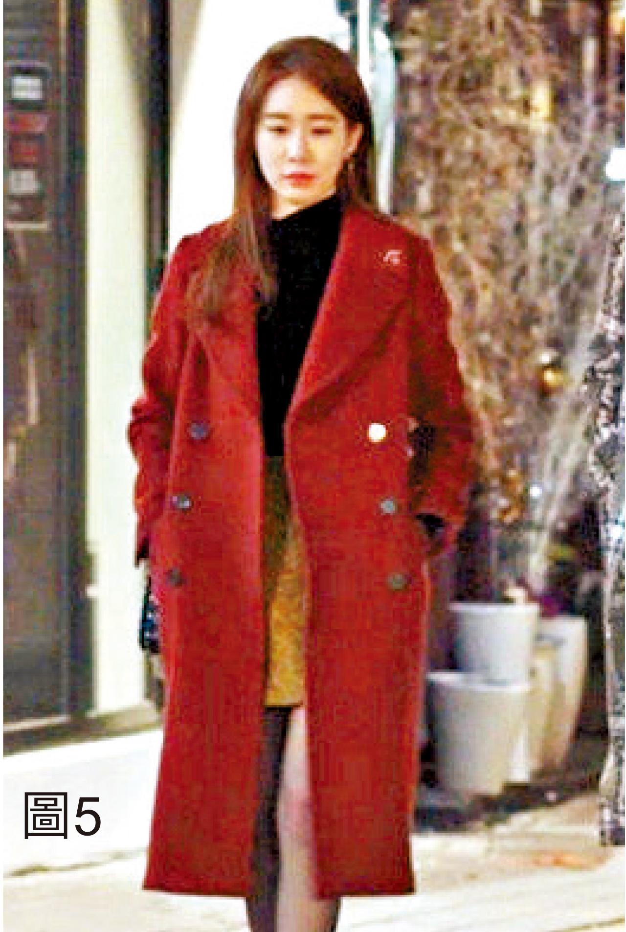 老闆娘今次著黑色樽領衫配泥黃色窄身裙(圖5),再利用暗紅大褸點出低調奢華味,柔美前衛的配搭,時尚又迷人。