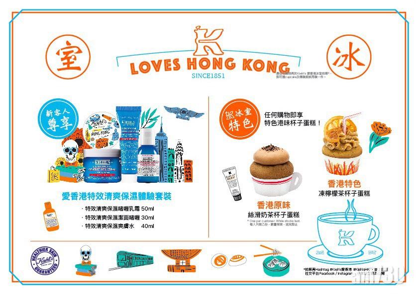 憑任何購物再於Kiehl’s 愛香港冰室拍照,即可獲港味杯子蛋糕(絲滑奶茶杯子蛋糕或凍檸檬茶杯子蛋糕)及精裝版試用裝一件