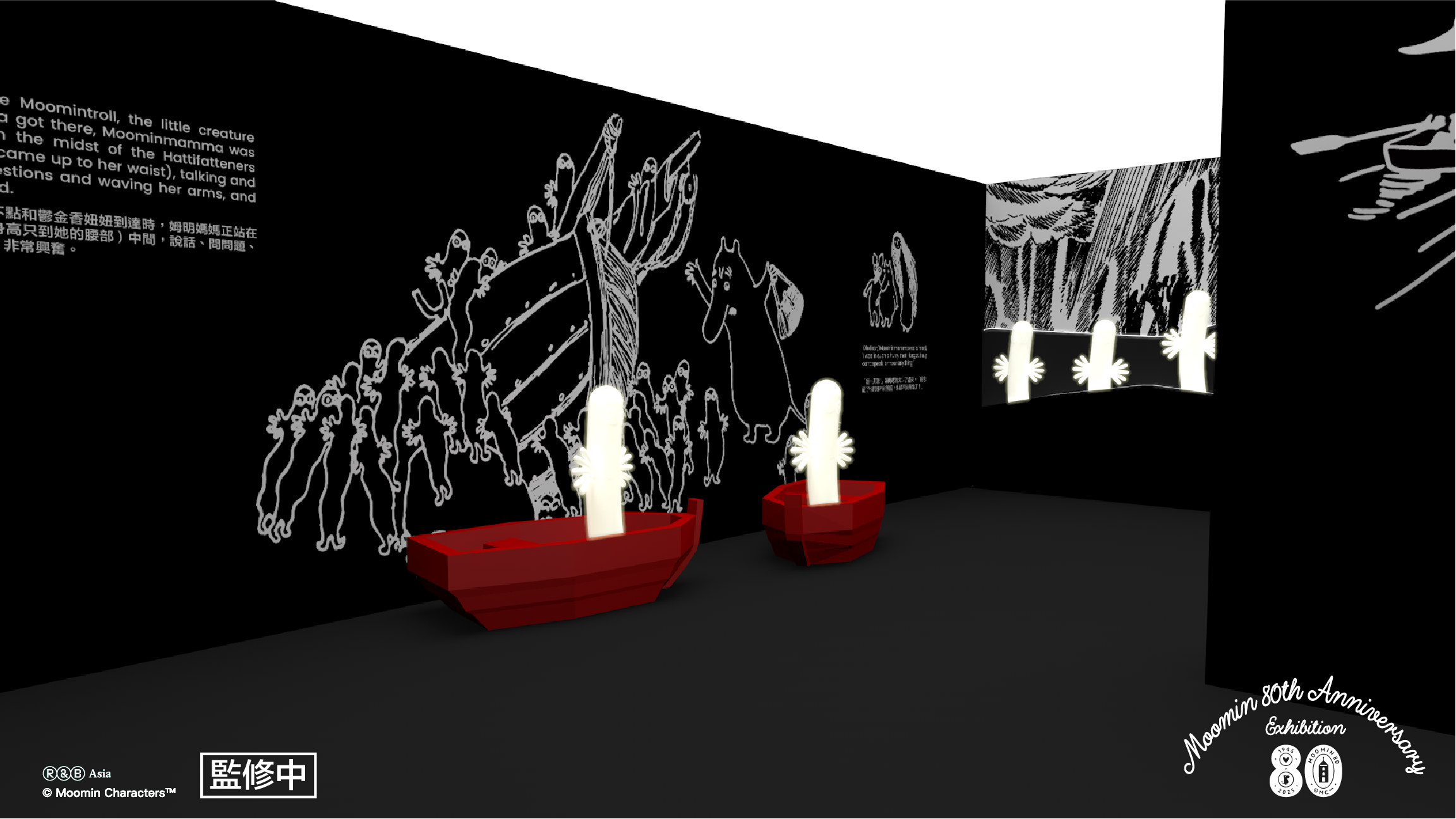 展覽終點設置「歷史長廊」,呈現姆明一族從1940年代至今的演變歷程。展區內陳列複製手稿、珍貴宣傳紀念品,並設有專屬書牆展示原著小說與圖畫書供觀眾瀏覽。