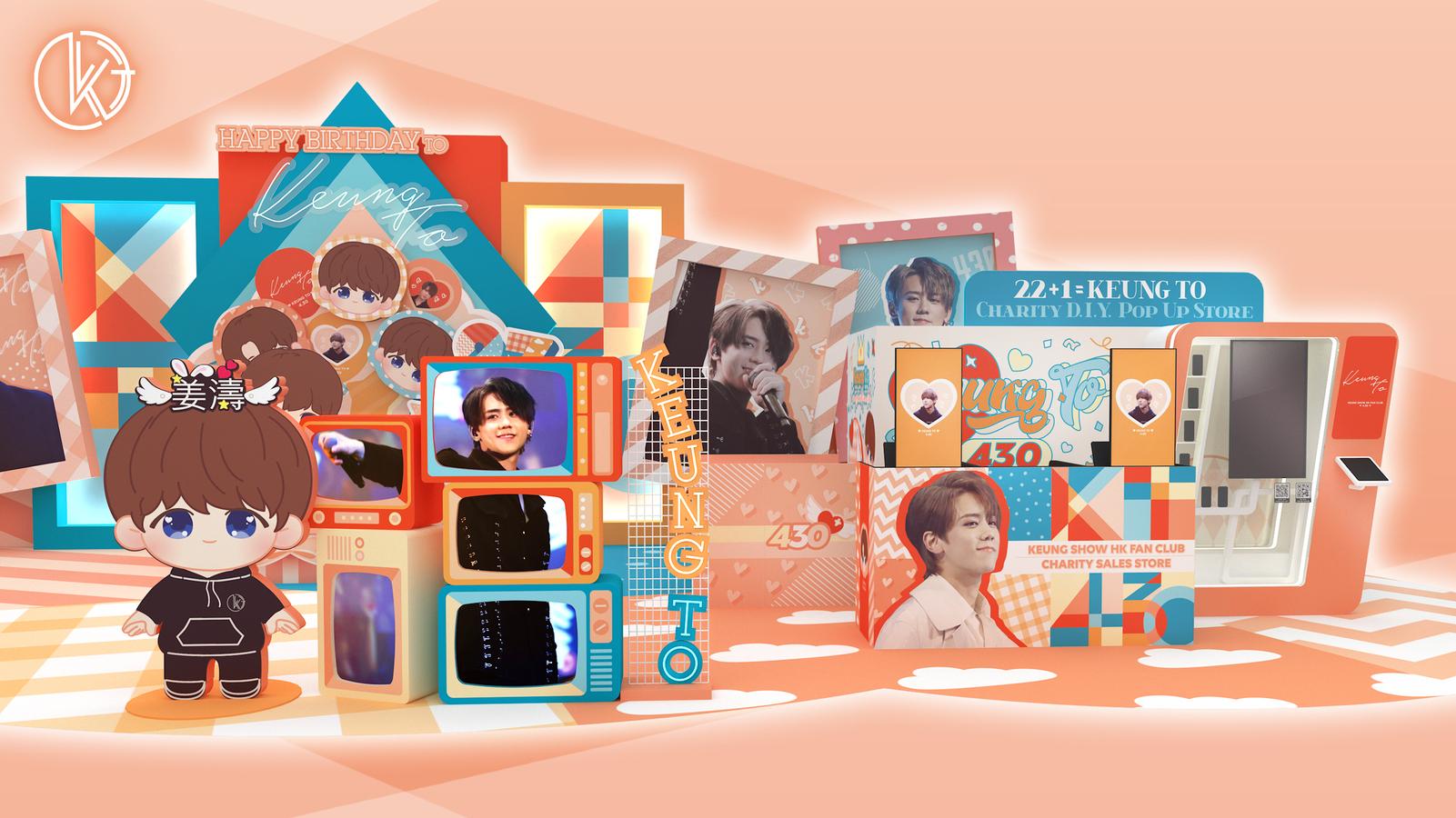 位於銅鑼灣皇室堡的「22+1=Keung To慈善限定店」同樣以桃橙色作主調,以多首姜濤的作品說出其故事,6大打卡位充滿普普藝術風,配搭型格十足的幾何圖案場景,展示姜濤的重要「事件簿」:表演、美食,當然還有姜B最愛的籃球。
