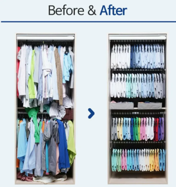 收納整理可讓自己可方便找到衣物。這款衣架兩側,不但可以折疊,還附上輔助架,助固定於掛鈎上,以衣架幫你摺衫,而且可以整理衣服,和不同尺寸大細,S 形結構也不怕扯鬆衫領。將衣服長度收短、歸一,以便騰出下方位置,可加多枝掛杆或配用抽屜,也相對增加空間放置其他衣物。